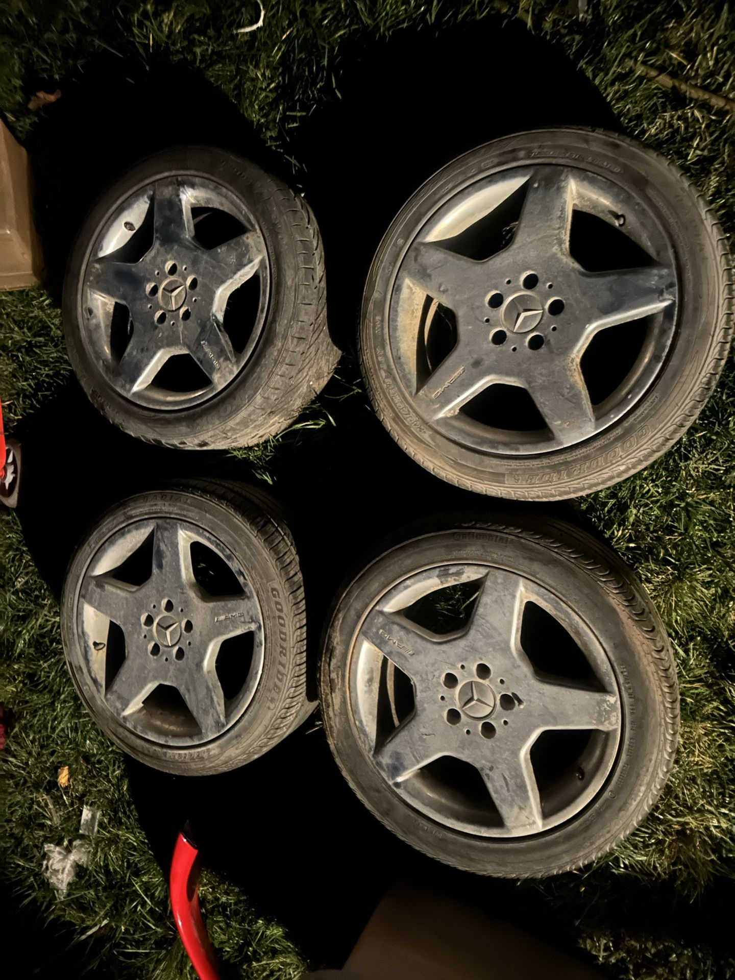 Set of 4. Fair condition overall. Some curb rash and scratches and scuffs. Chrome peeling in some spots. Not show quality wheels but ok for daily driver. Came off 2000 Mercedes S500. Will fit S500 and CL500 and CL600 cars. May fit other models. Please check for compatibility. Tires are no good. Weather rotted. Rims are dirty…. But will clean up nicely. $450 for the set of 4.