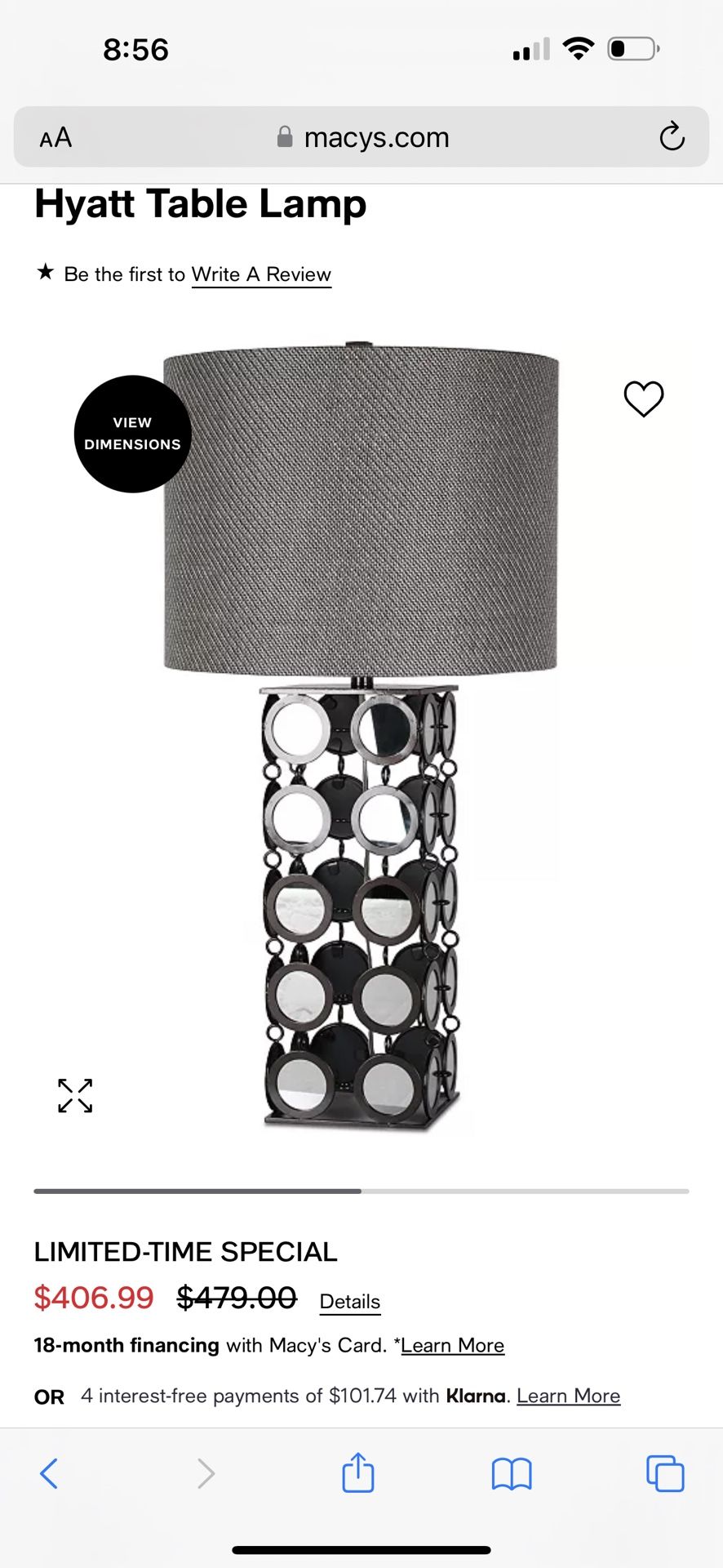 Beautiful New Modern Hyatt Table Lamp. Metal and glass base with cotton and polyester gray shade. Please see pictures for dimensions. No box. Prices online vary from 180+ to 400+ Cross streets: S. Rainbow Blvd & W. Tropicana Ave Se habla español.