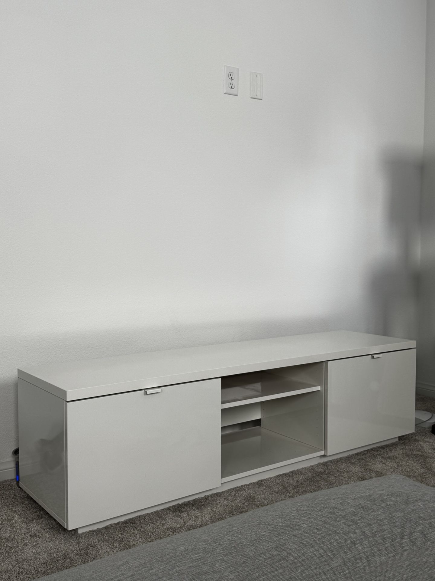 IKEA BYAS Tv stand Perfect condition No scratches or anything ✅ Edges are all good ✅ 9.9/10 condition ✅ Retails go $150+taxes Assembled already ✅ See photos for dimensions Pick up only in CHINO, CA $120 firm Tv stand, furniture, storage, office supplies, living room, loft