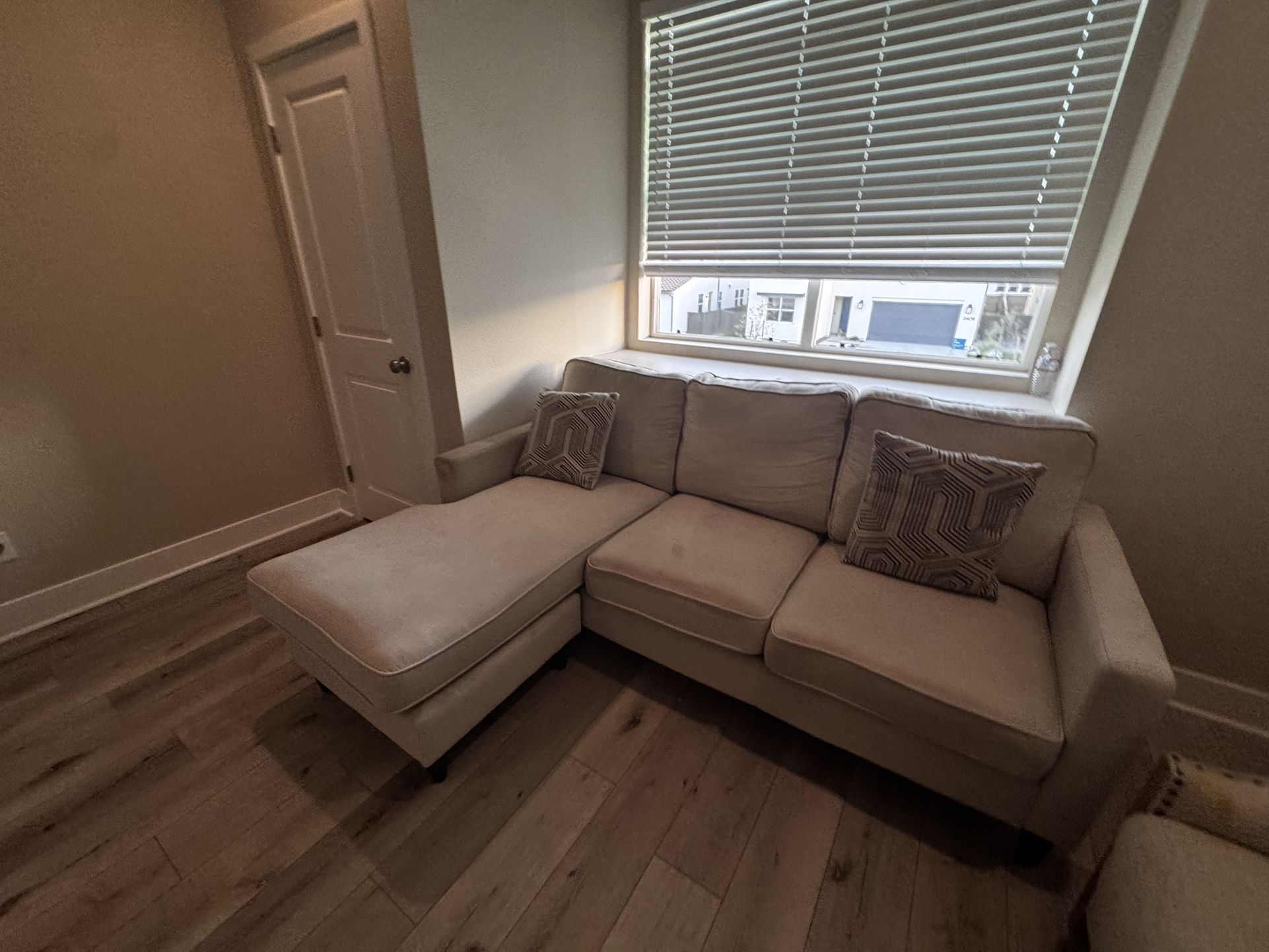 Beautiful beige sectional sofa with chaise in clean, well-kept condition. Modern, neutral design that fits easily with any decor. Very comfortable and spacious, perfect for a living room or family room. This sectional has no stains and is in good condition overall. Cushions are supportive and the sofa is solid and sturdy. Smoke-free home Pet-free home Neutral beige fabric All cushions included Selling due to moving. Pickup only. Cash or Zelle preferred. Message me if interested.