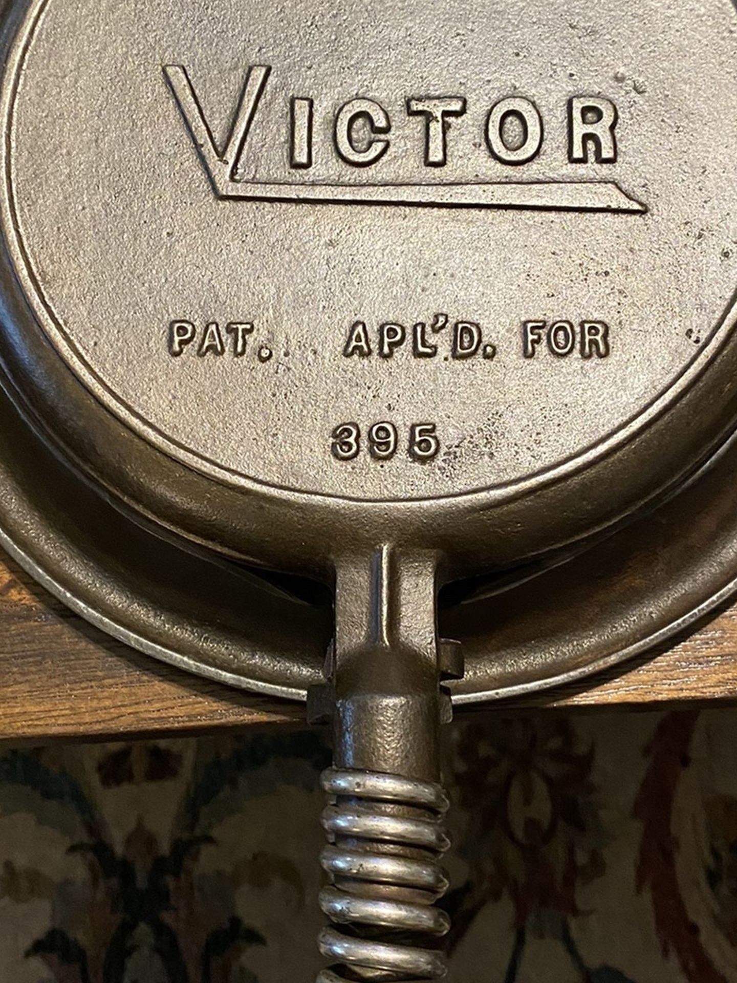 VICTOR #8 WAFFLE IRON # 395, LOW BALE HANDLE BASE. SPRING HANDLES, Lye bath, E TANK, seasoned X3, base seasoned x1 with BUZZY’s BEAUTIFUL EXCELLENT CONDITION