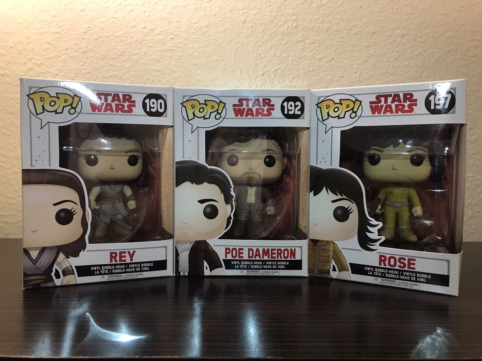 Star Wars Pop Funko Bundle!!! ~*BRAND NEW*~ Featuring three Funko Pops of the Star Wars Sequel Trilogy Heroes, Rey, Poe, and Rose. All boxes are in great condition, please refer to the picture to see the condition of the boxes.