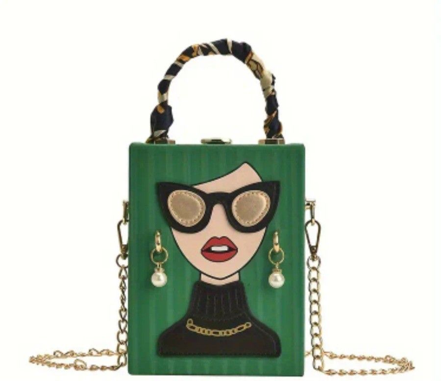 Super chic green bag with lady women face design. Super cute and quality durable PU leather material. Gold chain crossbody strap. Top closure. Size 7 Hx 5 W x 2" D. New item.