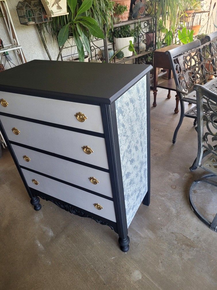 It has been refurbished with black, Gray and mottled gray. With gold drawer pulls. Drawers slide with no problem . 18 in deep by 34 in wide by 42 in tall. If the ad is up, it's still available. Located in Jurupa Valley