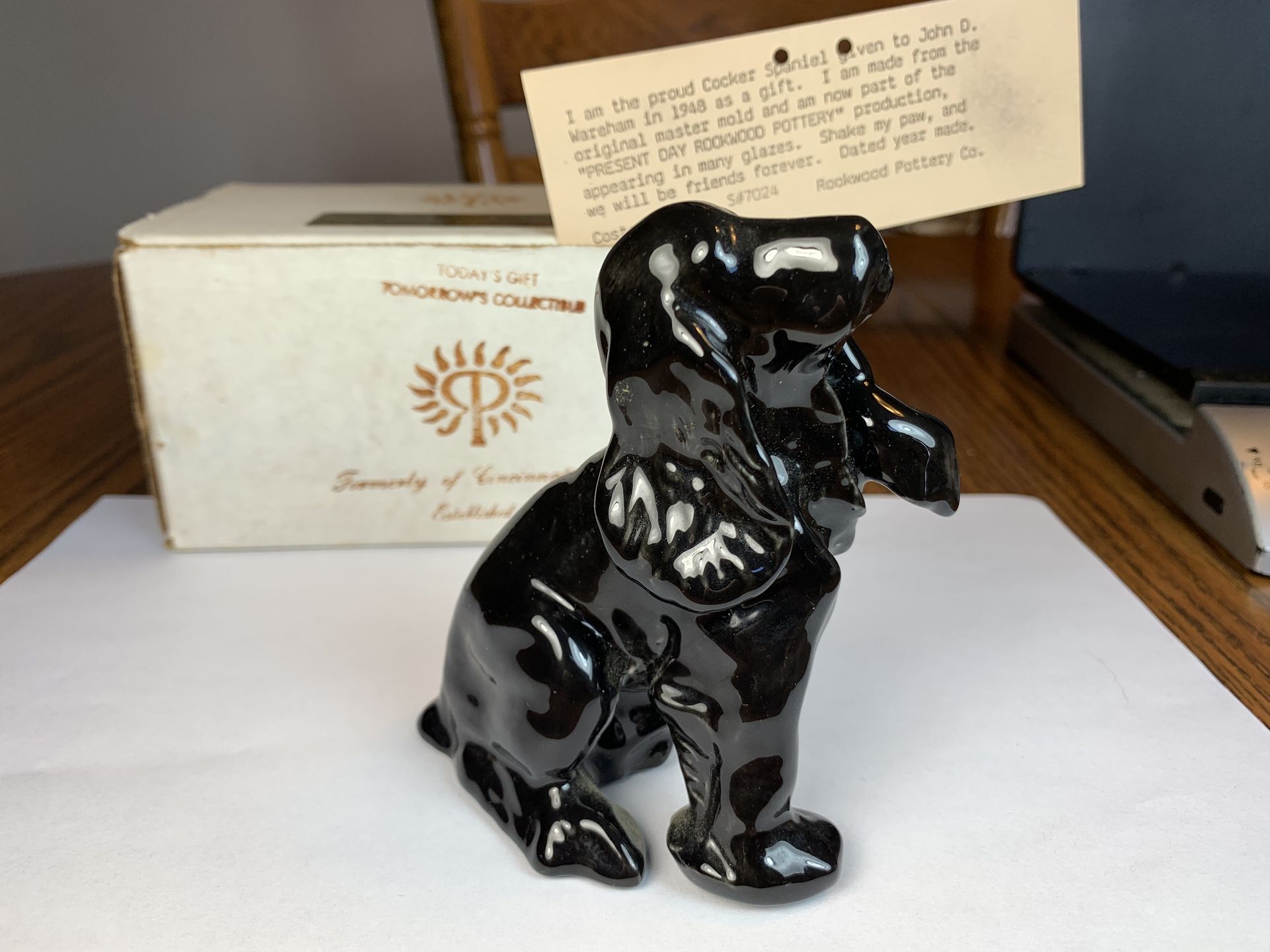 Vintage Rookwood Pottery Cocker Spaniel Dog Figurine Original Box,Tag RARE BLACK. Beautiful mint condition Rookwood Art pottery cocker spaniel dog figurine or paperweight. Has original box with original tag. Weighs 15 ounces. No chips, cracks, no crazing. Used Indiana estate find. Ships same day from Indiana. See all my pictures as they are part of description. Pick up in New Castle Indiana or shipping is posted.