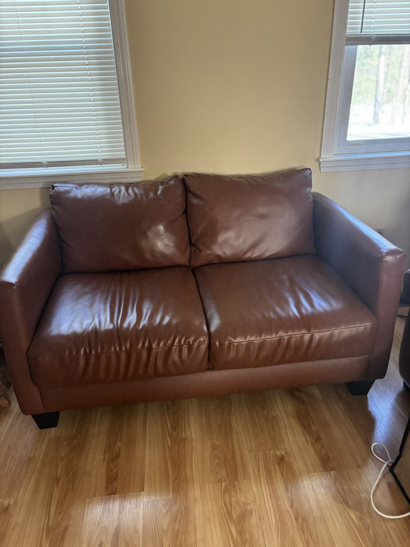 Free faux leather couch great condition. Downsizing and couch must go. Pickup Only. Must carry out yourself. Dimensions 58” W x 34.5” D x 27” H