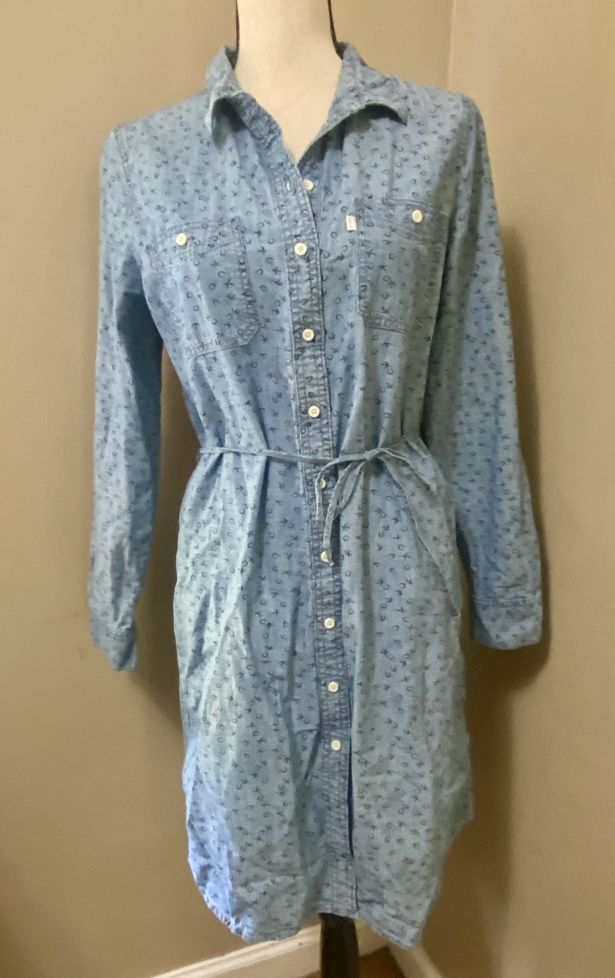 Levi’s Chambray Blue Denim Shirt Dress Button Up Western Horseshoe Bird Print L Great used condition. Only light wear. Comes with waist tie. Measures: 21" armpit to armpit, 36" length from shoulder to bottom hem, 20" across waist, 21" across hips. Loose fitting.