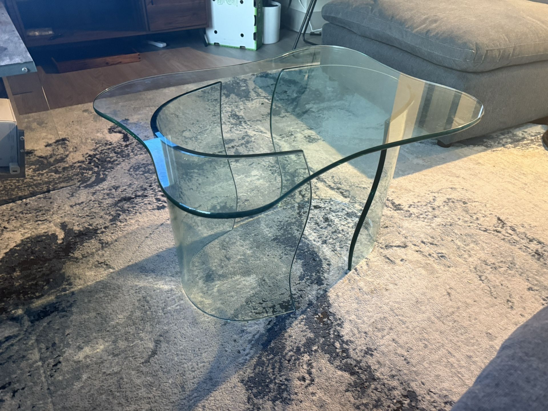 abstract glass coffee table - solid clear glass 1/2” thick - very good condition Glass coffee table - moved and no longer have a good spot for it $50 OBO Heavy duty nice solid stable glass table. Comes in 3 pieces - 2 curved legs , and the top couple small scratches Dimensions: table top: 30” x 23” height: 18.5”