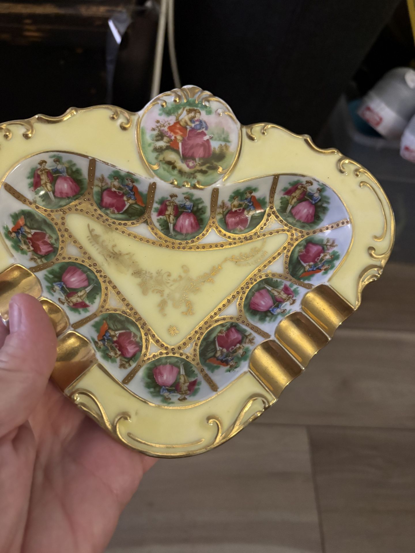 Vintage heart shaped porcelain, china ashtray by L`Amour China featuring a Victorian Love Story Numbered on the back with AJ3933 Vintage triangle shaped porcelain, china ashtray by L`Amour China featuring a Victorian Love Story with 12 small scenes and 1 Large scene. features Gold trim on the edges & resting areas along with Gold Beading around the inside of the ashtray. Marked on the back of the ashtray is: L`Amour China (Stamped), Japan AJ 3933