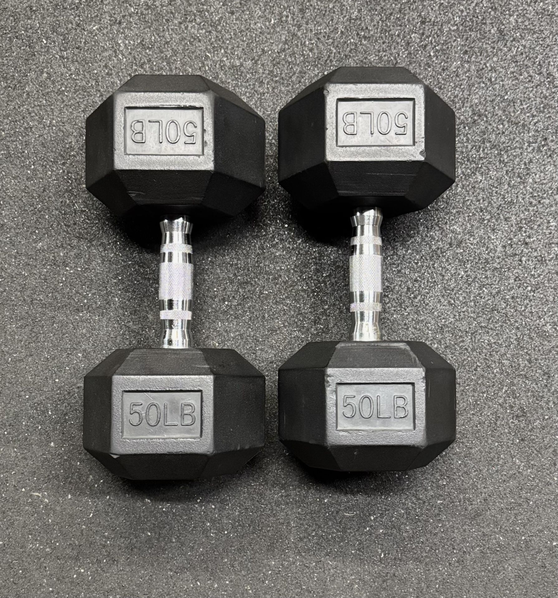 Brand new in box sealed pair of 50 lb Rubber Hex Dumbbells Disregard Keywords: Rogue fitness, rep fitness, Titan fitness, home gym, body building
