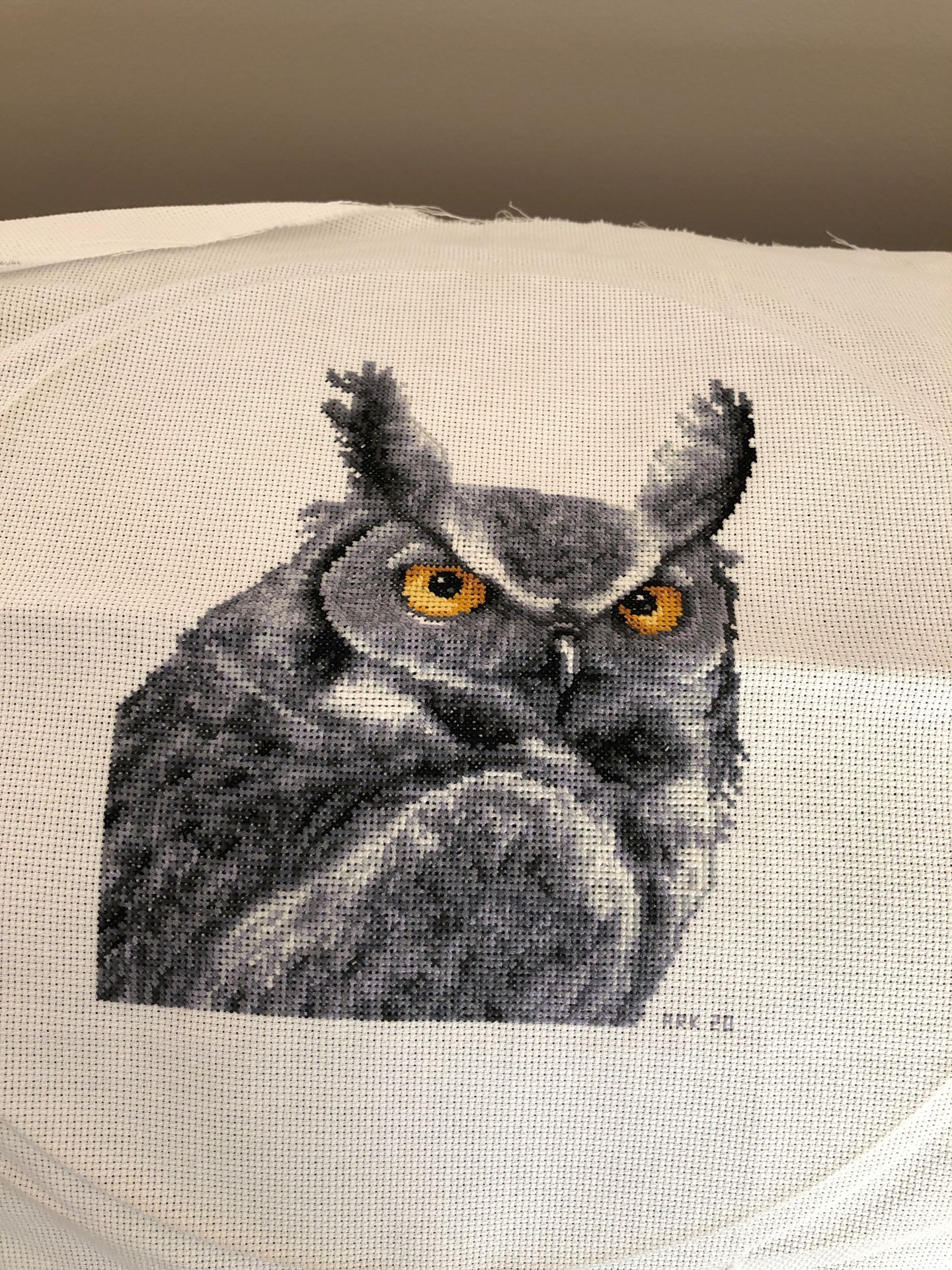Ready to frame, completed Owl counted cross-stitch. Full size is 11 3/4 x 14”.