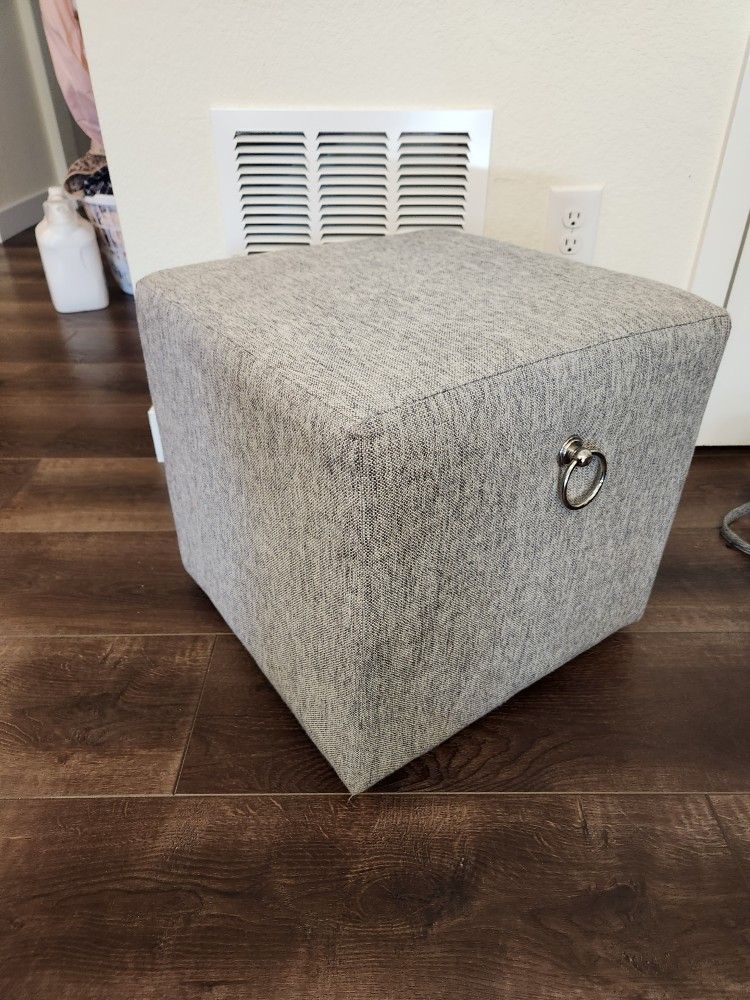 gray linen fabric ottoman with white plastic caster wheels and 2 metal rings, clean and great condition