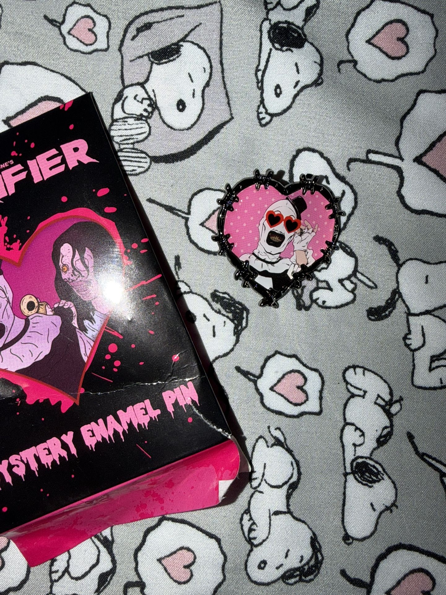 Super cute Art the Clown pin with red heart eye sunglasses! It comes with the original packaging (it’s just a little ripped on the side).
