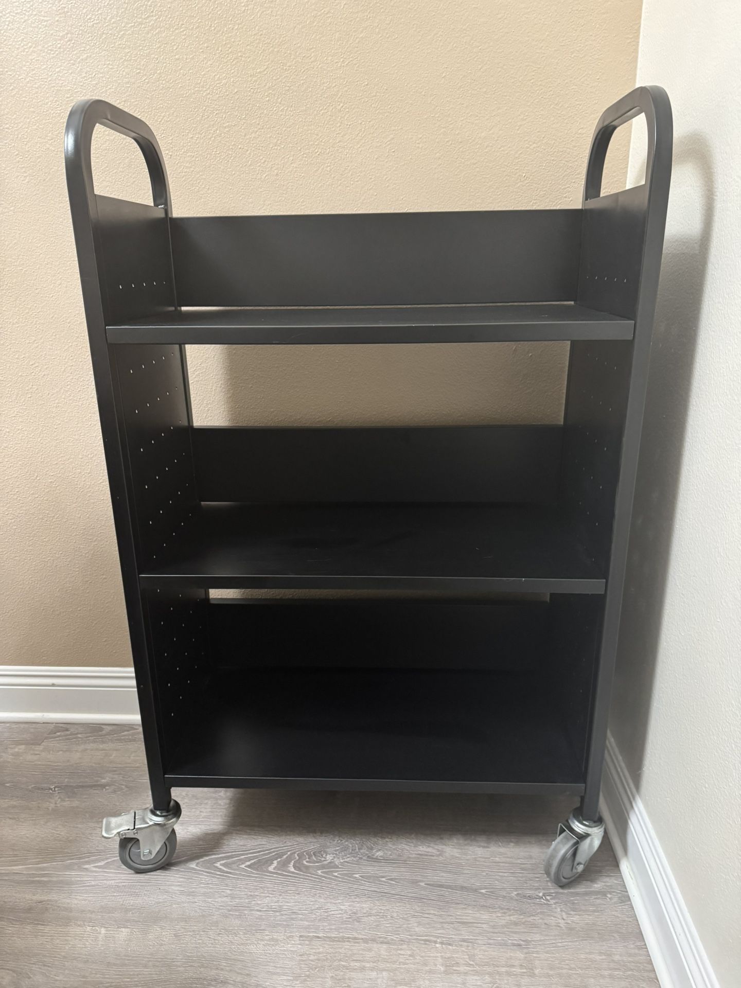 Book Cart, Hand Truck. 330lbs. Capacity, Black. Double Sided W-Shaped Sloped Shelves, 4 in. Lockable Wheels