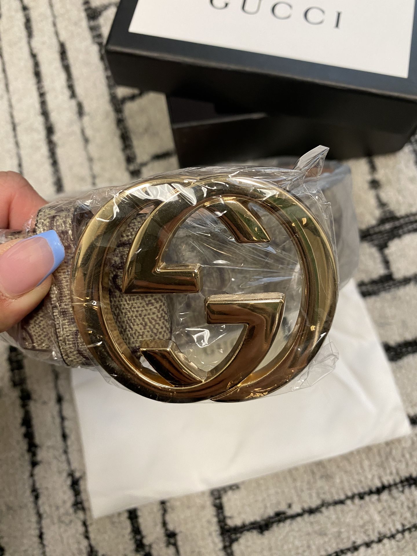 Brand New belt. Gold & Brown. Faux leather. Comes with box and dust bag along with a tool to make an extra hole on belt to adjust sizing. Buy at your discretion.