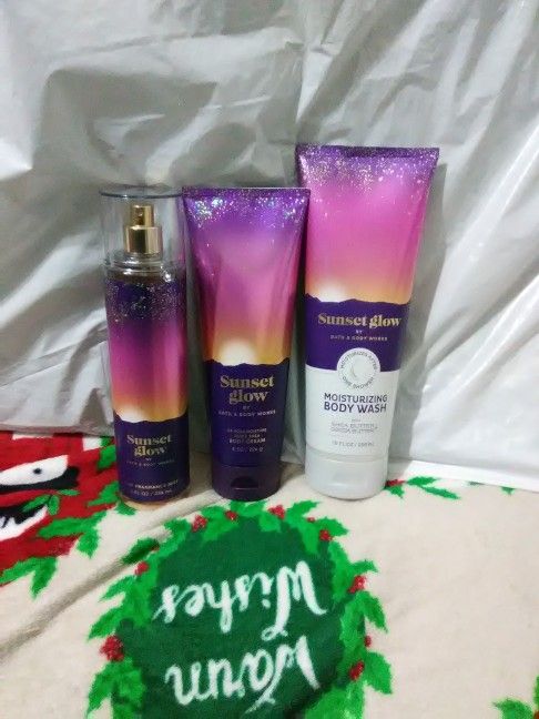 CONDITION NOTE: Some of the lettering on the back of the mist is chipped; it arrived this way when I originally purchased it. I've attached a photo, though it's not showing up great. Message me if you have any questions or you want more pictures of it! Like new Bath & Body Works Sunset Glow set of a Fine Fragrance Mist, a Body Cream, and a Moisturizing Body Wash! The mist and the cream have been used four times at most, but the body wash is brand new. These are all full-sized products, with the mist and the cream at 8 oz and the body wash at 10 oz. This is also a discontinued scent that is currently unavailable in stores or on the Bath & Body Works website. The scent notes are: Fresh Coconut, Sparkling Cherry Seltzer, Dreamy Moonflower, and Caramelized Vanilla. Comes from a smoke-free home.
