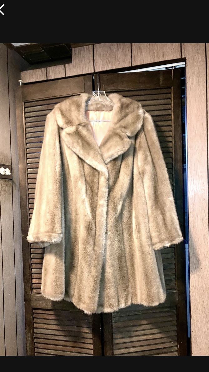 Surprise your lady with a fur coat for Christmas. Beautiful, luxuriously soft, tissavel FRANCE Genuine French Simulated Fur coat. Tan light brown. Mid thigh length. Hook and loop closures. Fully lined. 2 outer pockets. Treat and clean like fur. Ladies large. 12-14. Like new. Excellent condition. No makeup marks. Asking $75. Pick up in Glendale Heights. Check out my other posts please for more furs, warm winter coats and boots
