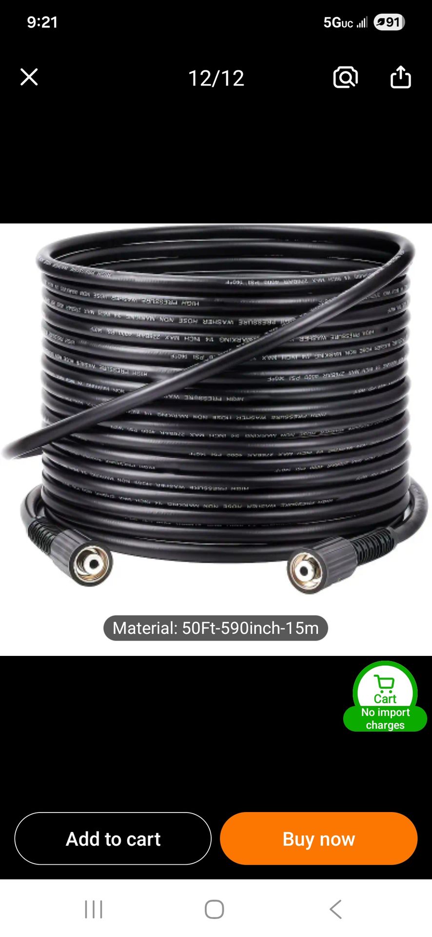 This hose was never used. I had to pay shipping for the return, that's why I preferred selling it here. 50ft 5800PSI High Pressure Washer Hose Black High Tensile Non-Marking, Durable Rubber Material, 22mm Internal Thread Diameter, Perfect for Cleaning, Forestry, And Gardening. Connector is 14mm (check pictures.)