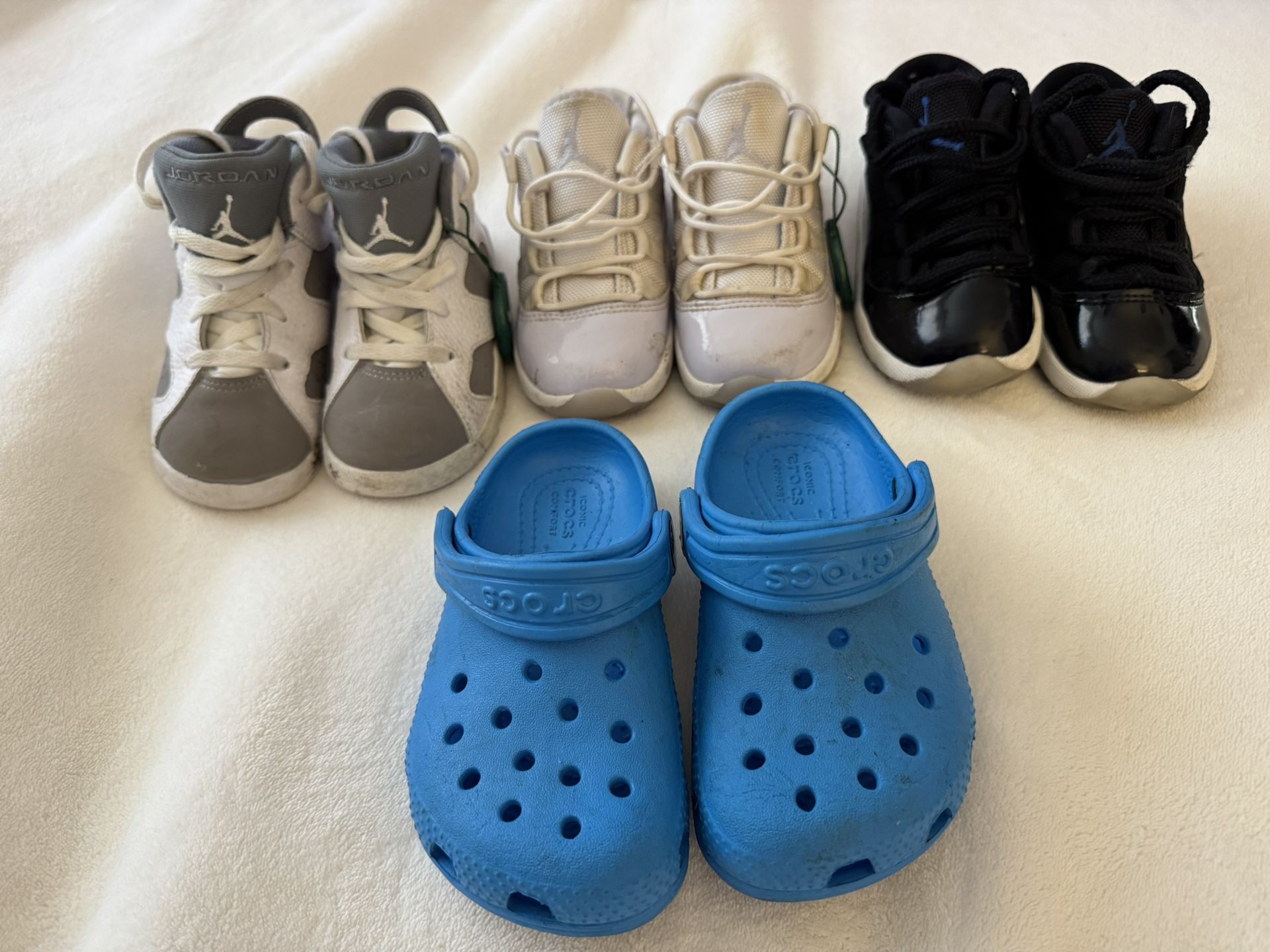 2 pairs are 8c (white & gray) and (lavender & white) Black pair is 7.5c The crocs are size 8c Jordan’s $20 a pair. Crocs $10 Lightly worn