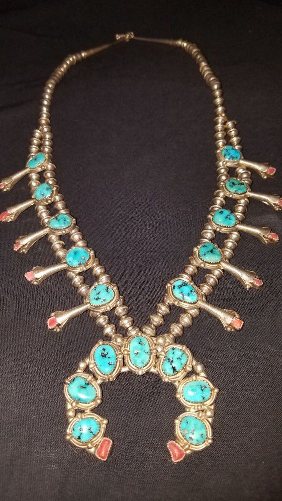 Genuine Turquoise & Coral squash blossom Sterling Silver necklace!!