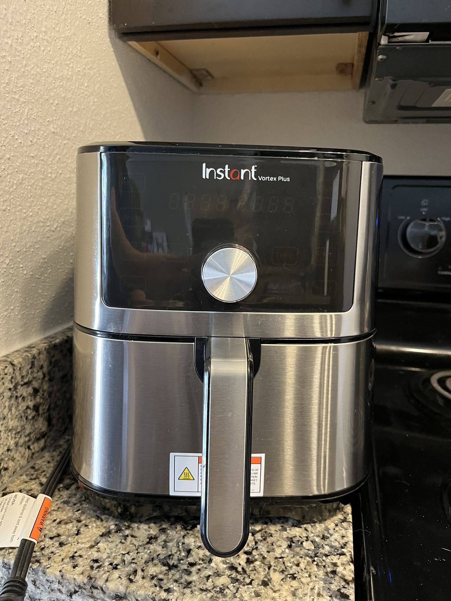Used once. Almost new. Stainless steel Dimensions: 10.2"D x 13.03"W x 11.02"H 6 Cooking Functions: Air fry, bake, roast, broil, dehydrate or reheat with little to no preheating time Adjustable Temperature: Dial it in from 95 to 400°F (35 to 205°C) User-Friendly Operation: One-touch settings make everything from chicken wings to cinnamon buns ridiculously Compact Yet Capable: Small size saves counter space without sacrificing capacity. Its 4-quart capacity is perfect for up to 4 servings EvenCrisp Technology: Achieve the perfect crunch with 95% less oil than traditional deep frying Quick Cleanup: The non-stick air fryer basket make washing up effortless