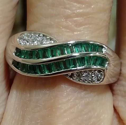 Up for sale is this very beautiful new stamped 925 solid sterling silver ring SIZE 8 with gorgeous baguette style stones set into the band with beautiful lab-created green Sapphires and white Sapphires in kind of a criss-cross pattern. It's very beautiful in person! From our smoke-free home. Pictures shown in different types of lighting.
