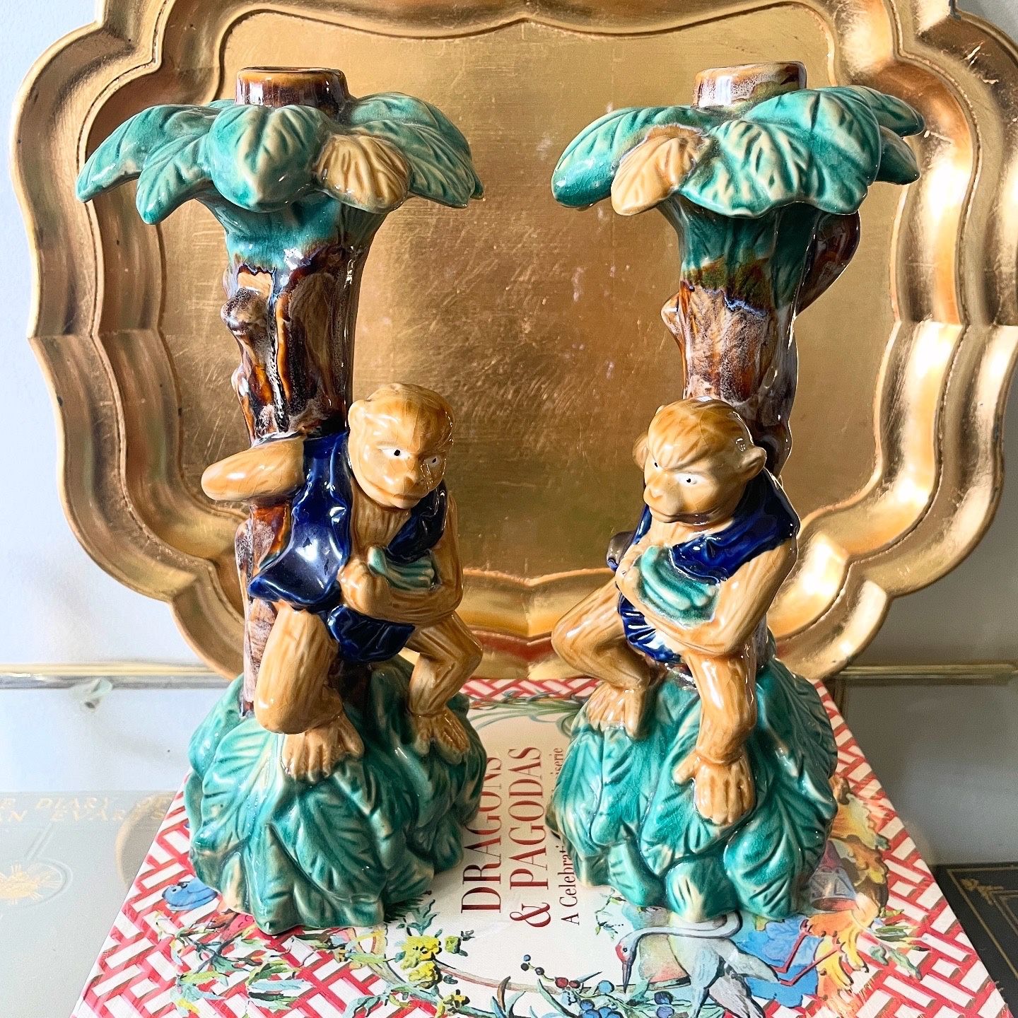 You don’t want to miss this magnificent monkey duo! Add a touch of whimsy to your décor with this pair of vintage Majolica monkey candle holders! Featuring intricately crafted monkeys wearing cobalt blue vests perched on lush green foliage standing by a tree, these candle holders are richly detailed and vibrant, with a clear glaze. Each one 12” H x 5” W x 4.5” D. Ideal for collectors and lovers of vintage majolica pottery, chinoiserie lovers and Palm Beach style enthusiasts! They are both functional and decorative, each taking a standard taper candle, making them a delightful addition to your home. Both are in excellent vintage condition with no chips, cracks or repairs, and only minor crazing in some areas indicative of more than 50 years of age. Local pickup or I can ship.