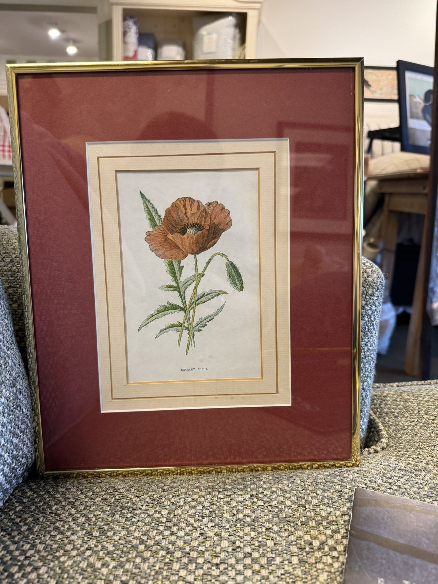 Beautiful late Victorian botanical chromolithograph titled Scarlet Poppy, dating to the late 1800s (approx. 1877–1900). This piece was printed in London by Benjamin George, a well-known 19th-century commercial lithographer, and comes with an original certificate of authenticity from William Dennis & Son Ltd., a respected British/Canadian antique dealer. The colors are still vibrant and the detail is lovely — a classic example of Victorian botanical art. Professionally matted and framed, ready to hang.