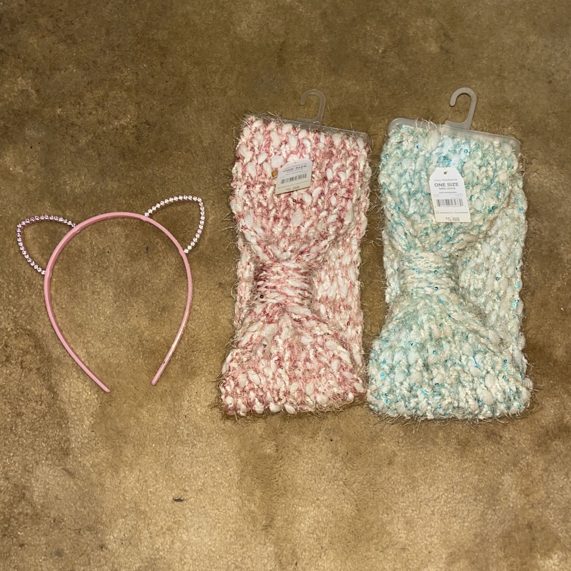 One plastic pink kitty ear headband And 2 cozy knitted headbands. Together or sold separately.