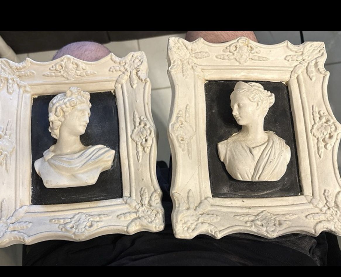 Rare matched pair of authentic 1940s vintage framed plaster relief plaques featuring neoclassical female busts in profile (elegant draped figures with updos, inspired by ancient Greek/Roman cameos/intaglios). Set in ornate white plaster frames with grapevine, leaf, and floral detailing around black recessed backgrounds—classic mid-century home decor with shabby chic, French country, or Victorian revival vibes. Material: Plaster/chalkware relief (lightweight yet detailed 3D sculpting, typical of 1940s production). Size: Approximately 10-12" wide each (handheld scale in photo—measure precisely for listing). Era: 1940s originals, great for collectors of vintage wall art, plaster cameos, or mid-century neoclassical pieces. Condition: Good vintage used—frames and reliefs intact with authentic age patina, light wear/surface marks consistent with 80+ years (no major chips, cracks, breaks, or repairs visible; display-ready as-is). From a smoke-free home in Boca Raton, FL. Charming symmetrica