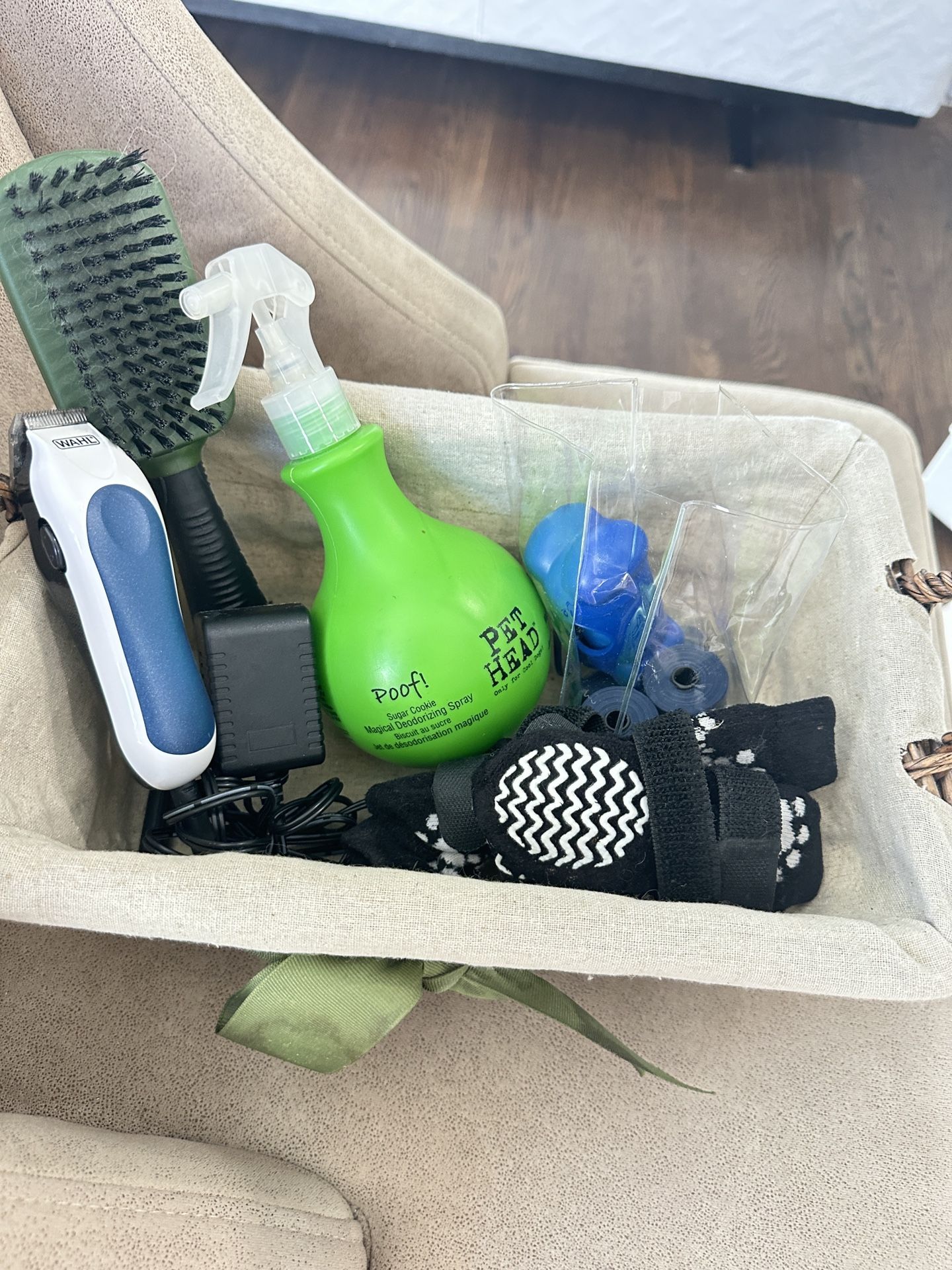 Pet grooming supplies bundle! Everything in photo including basket! Lots of goodies including: no slip socks, feeding bowl, veterinary ointment for joint pain, poop bags with bag carrier, fur sprays, pet brush! All in great condition!