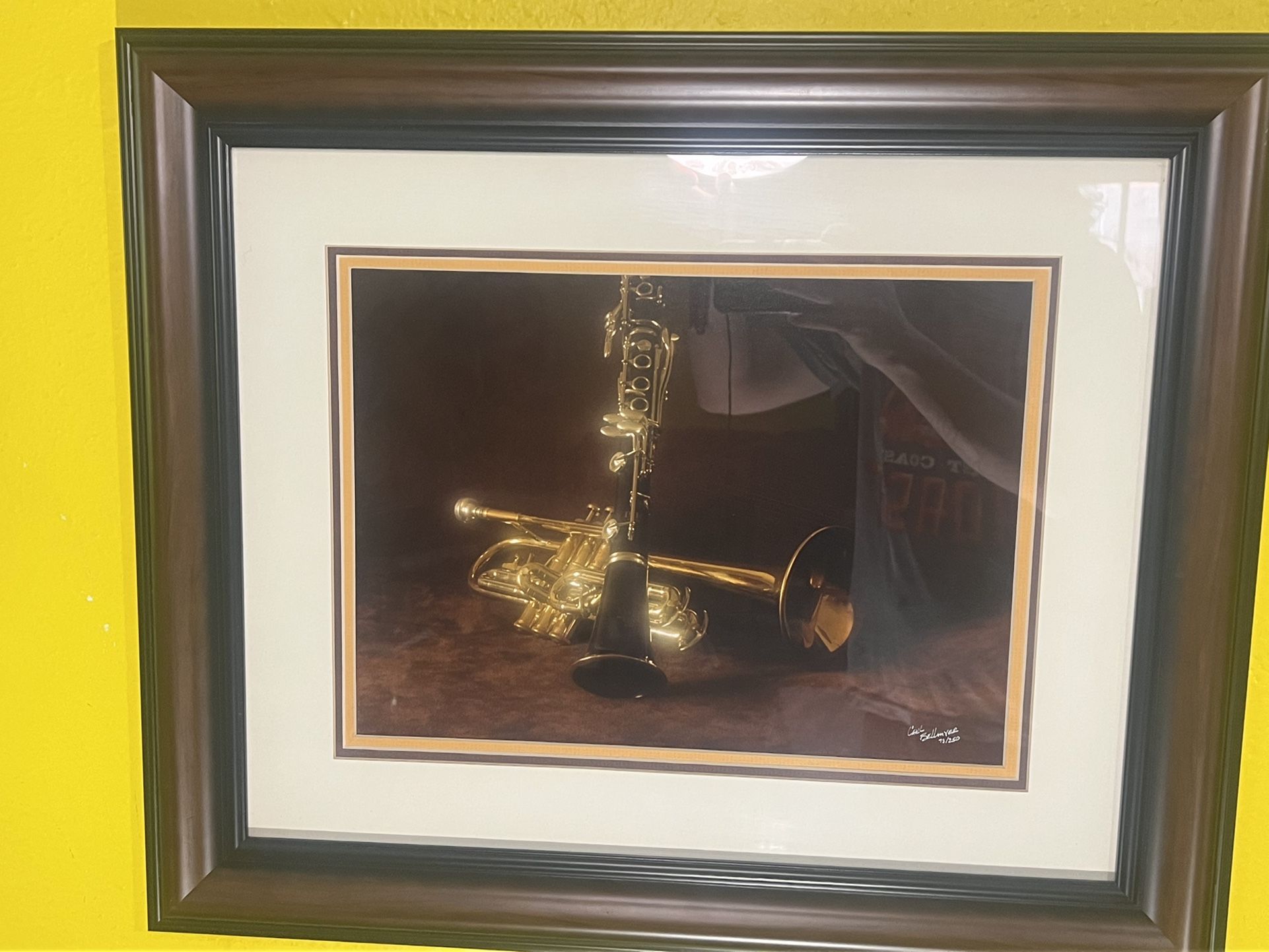 Beautiful hand signed and numbered still life photo of trumpet and clarinet by photographer Carl Bellmyer. Frames and triple matted with beautiful complimentary colors. Photo measures 10.5” x 14” and entire framed piece measures 24.5” x 20.5” Beautiful hand signed ready to hang art for well less than the cost of the frame.