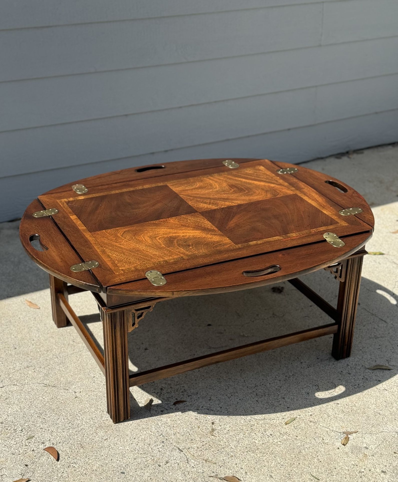 Vintage Lane convertible coffee/serving tray table. Brass hinges & hardware. Overall in great shape. Dimensions with sides folded down: 40” L x 33” W x 17” H Sides folded up: 32” L x 25” W x 17” H