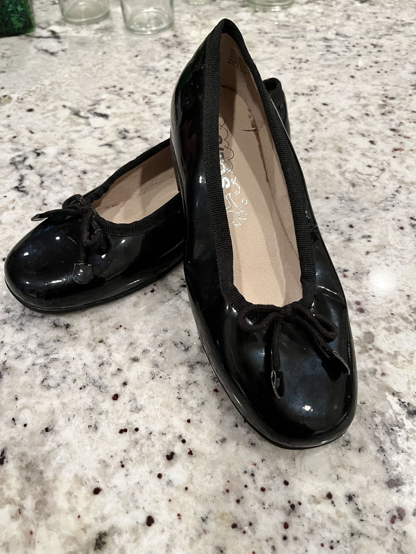 Brand new pair of girls, flat black leather line shoes. Sizes 34 and US size 4 pick up in Miller Place or willing to ship.
