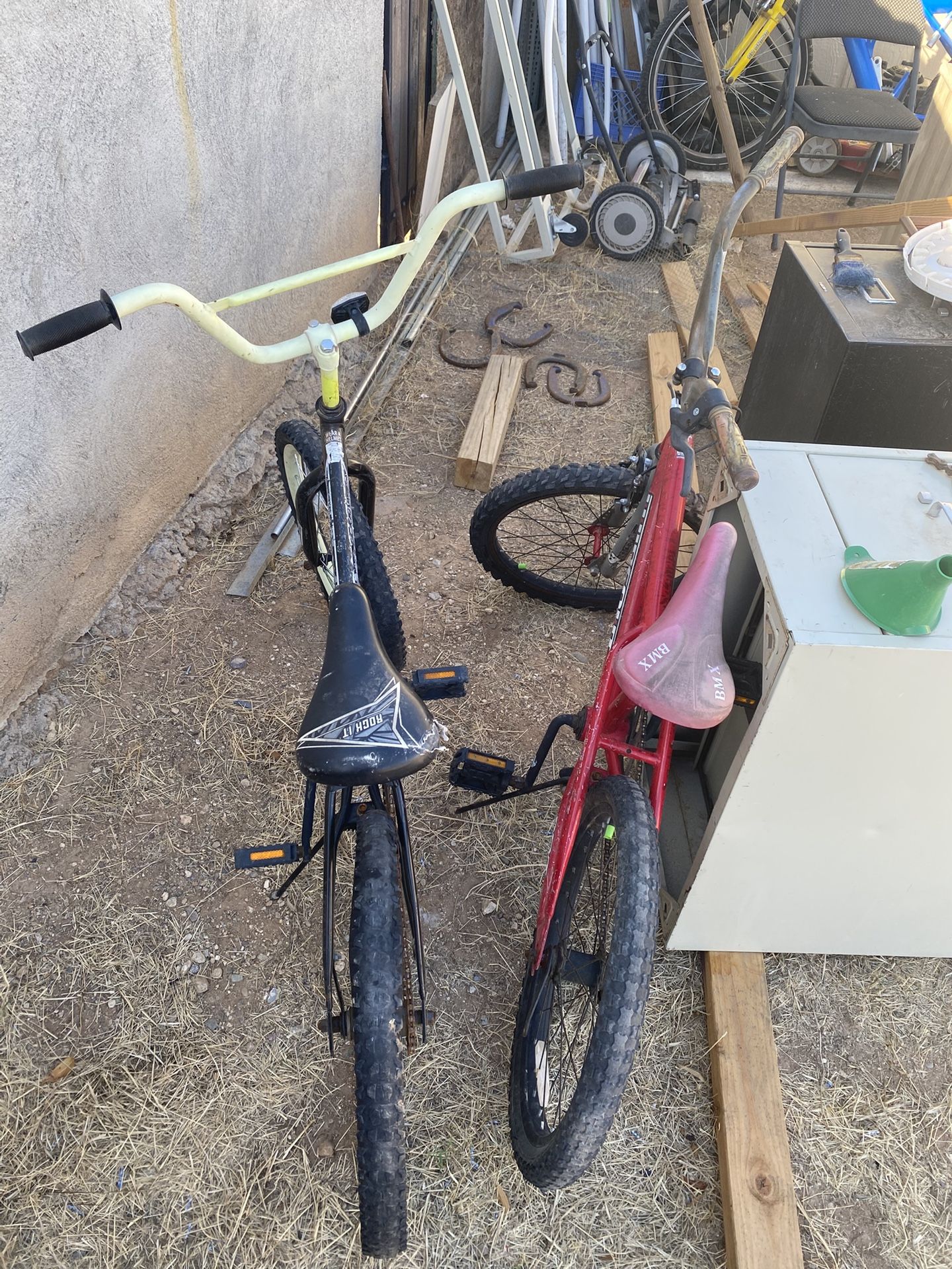 $10 each kids bike and $50 or OBO for adult bike. Selling as they are. They are all used. Red bike needs front tire. Green bike need both tires and has a tear on the seat. Adult bike needs a new seat.