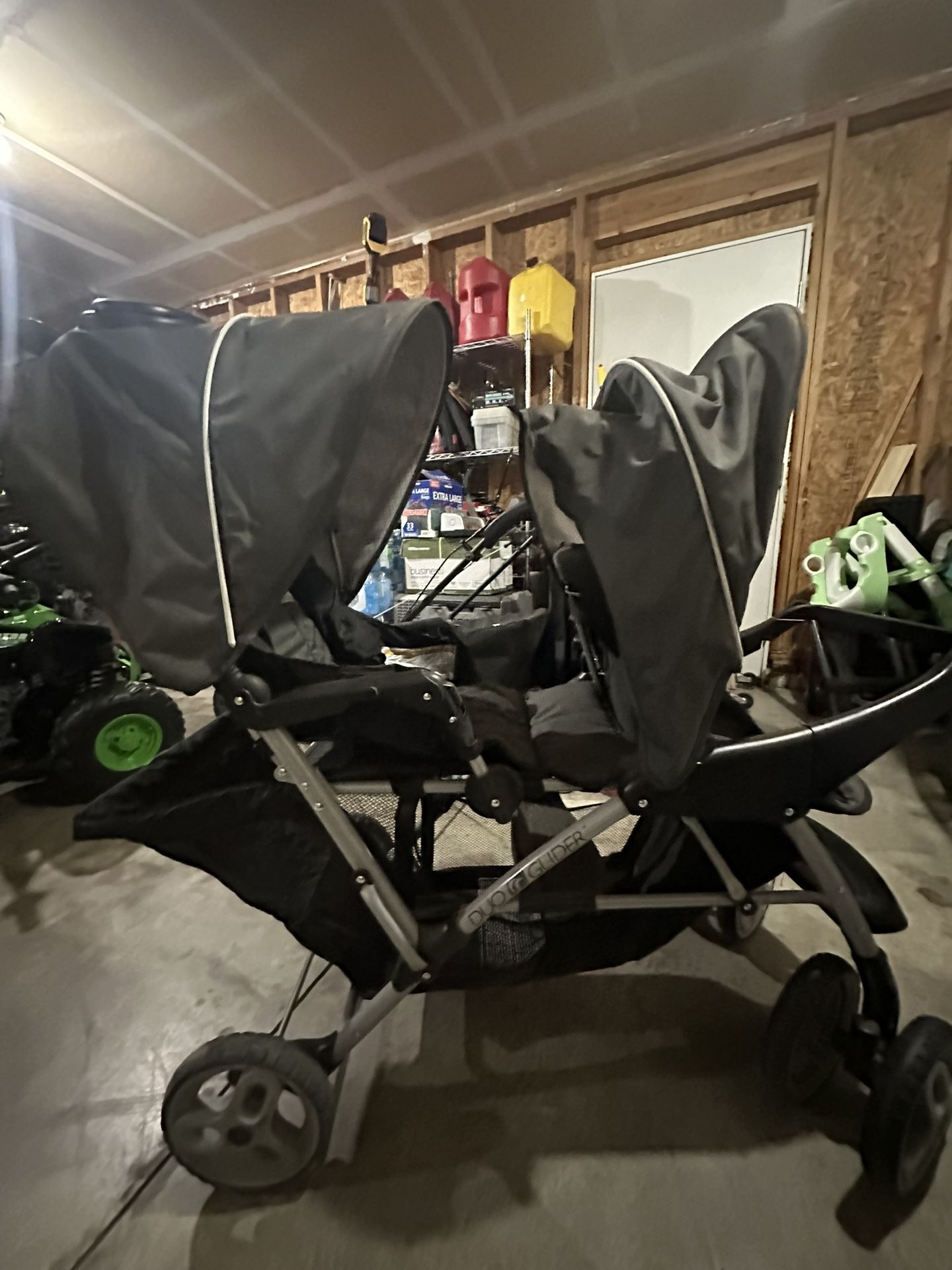 Stroller in good conditions for two baby or toddlers with drink holders and pampers carry bag. Not needed for kids.
