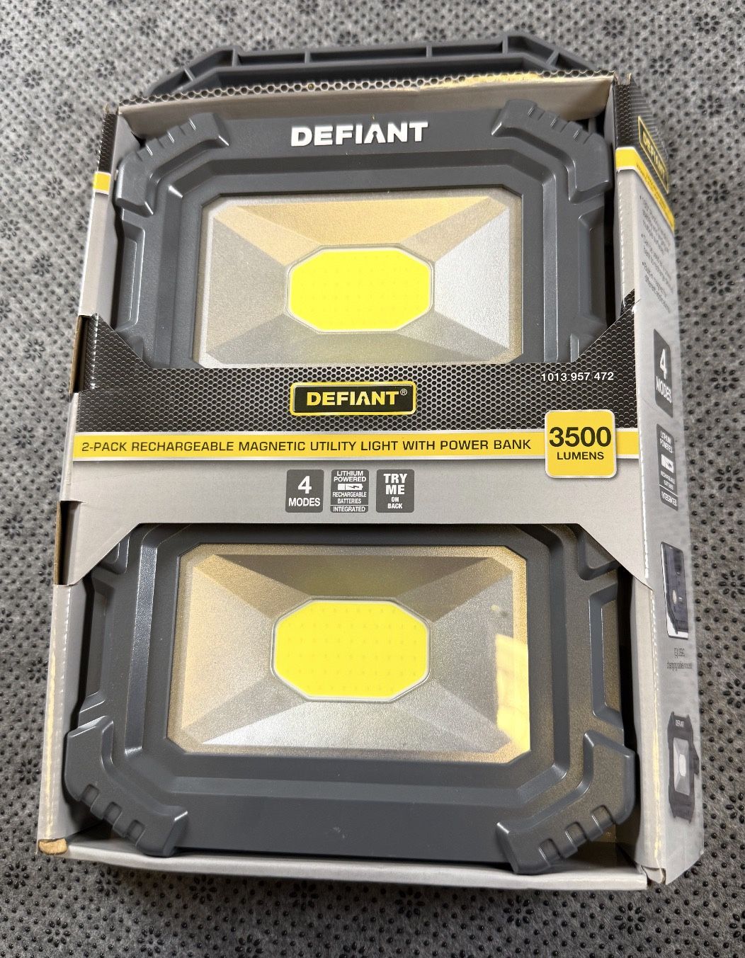 Defiant 2-Pack Rechargeable Magnetic Utility Lights with integrated power banks. Each light features a powerful 3500 lumen output with 4 distinct modes including High (3500 lm), Med (1500 lm), Low (500 lm), and Eco (100 lm). Built for durability, these lights include a 180-degree pivoting handle for easy positioning and a strong built-in magnet for hands-free use on metallic surfaces. Features: - Lithium-powered rechargeable batteries - Power bank functionality to charge mobile devices - Includes (2) USB-C charging cables - Up to 40 hours of runtime on Eco mode - Rugged, portable design Condition: New in original packaging.