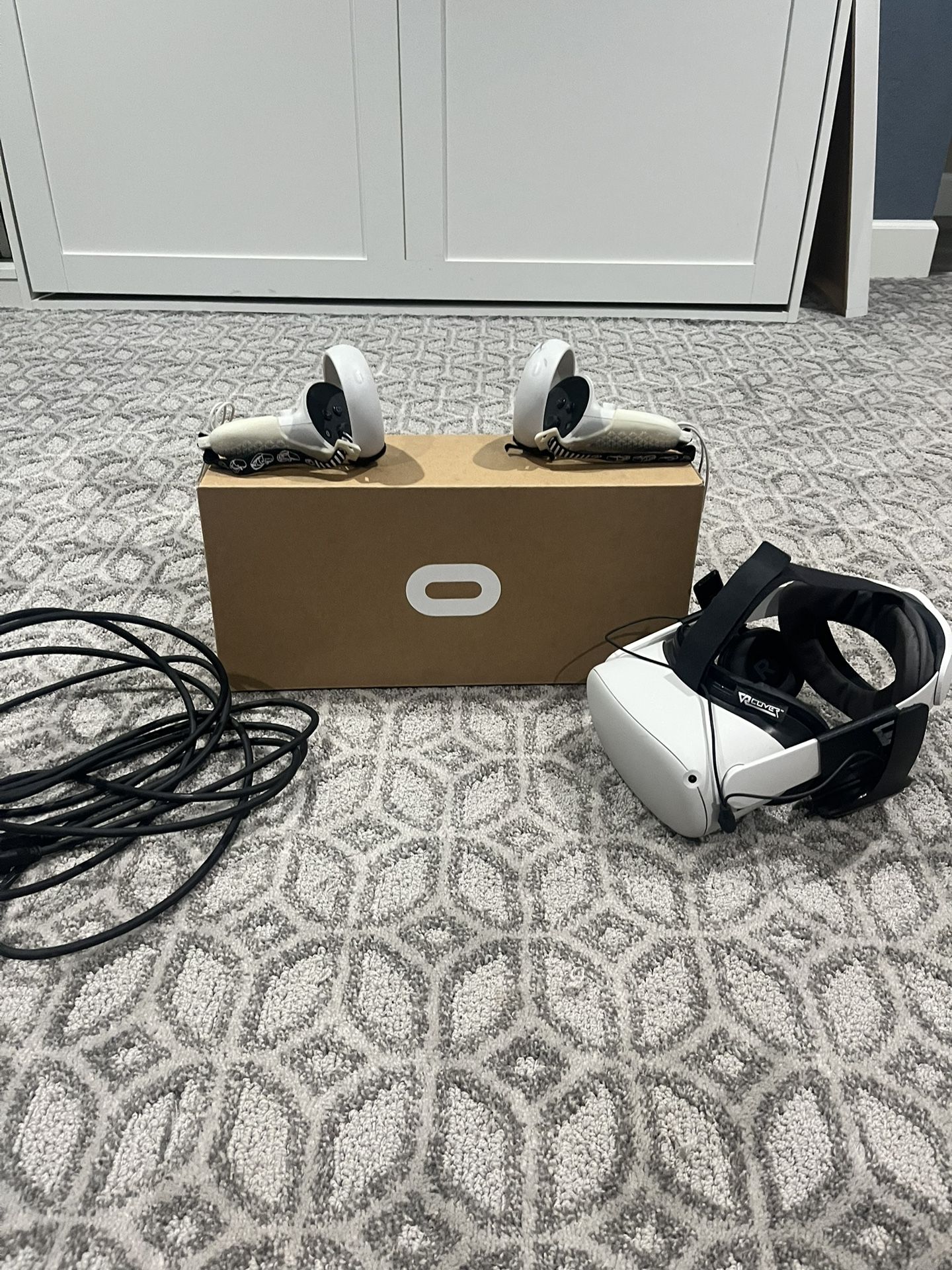 This is the 128gb oculus quest 2. I bought it used so at least 2 owners. Comes with: Vr cover face insert, Vr cover lens cover, Elite strap ( has been broken but was fixed ), Elite strap cushion, Amdvr controller grips, Over-ear headphones, Glasses spacer, Angled link cable, Original face insert,