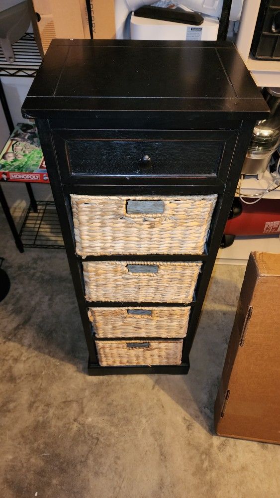 Distressed black dresser stand with a drawer at the top and wicker/rattan pull out drawers. Great for a laundry room or bathroom. Cash only please. 16 inch x 44.5 inch