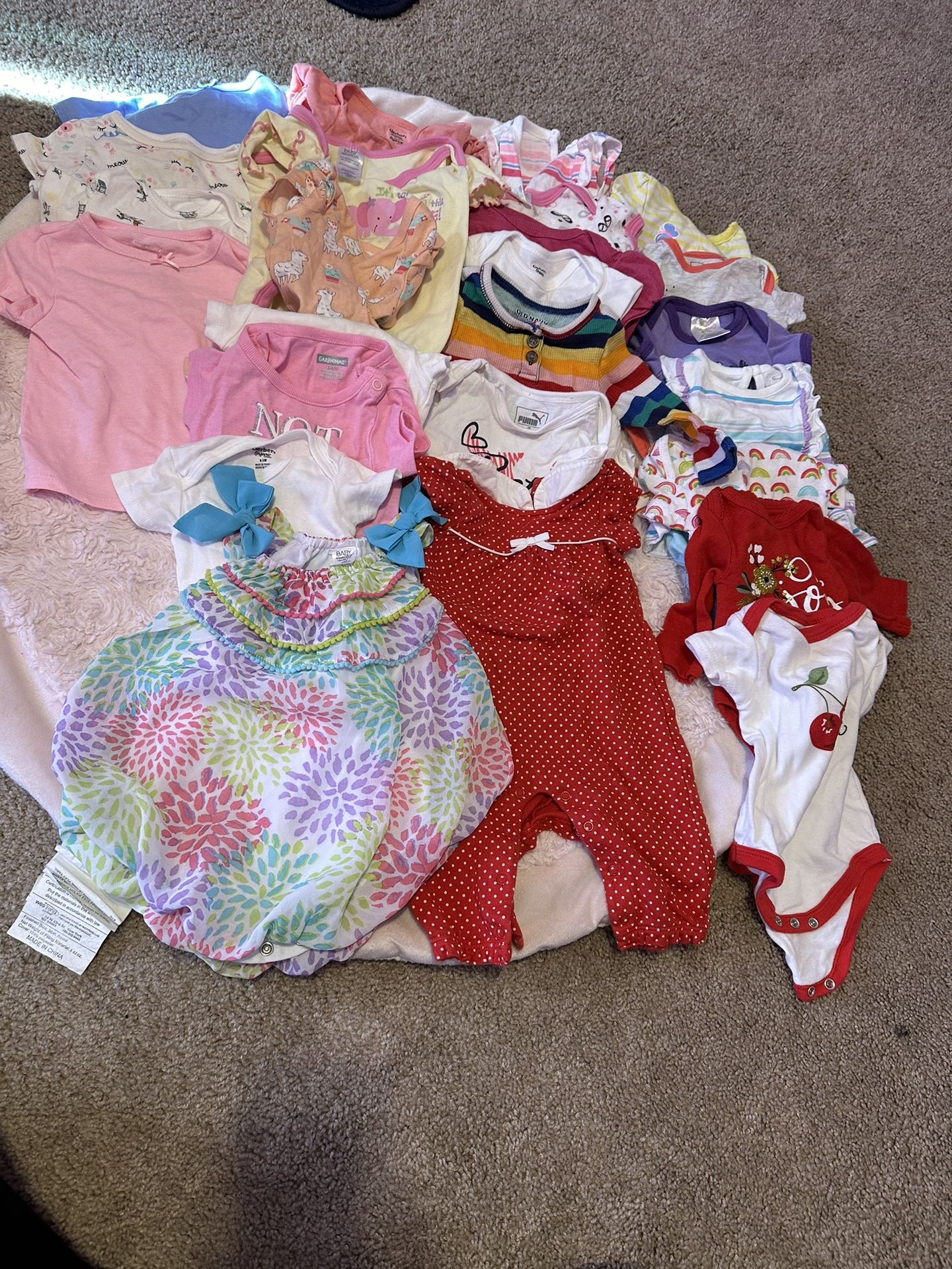 0-3 months girl baby clothes, towels, shoes and bathtub.