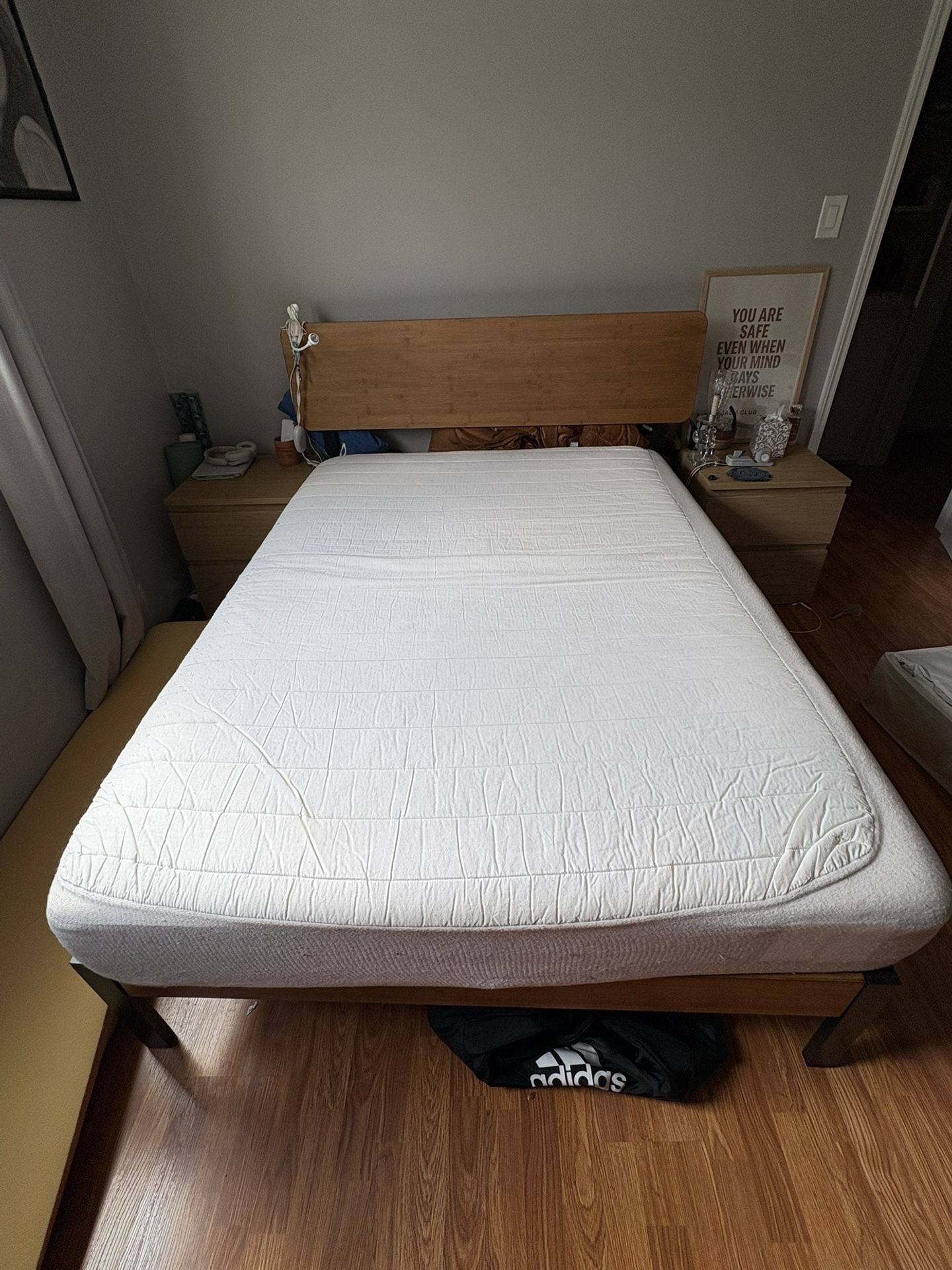 Modern wood and metal platform bed frame with wood slats (no box spring needed). The size bed is a full includes mattress and mattress topper for added comfort — ready to use immediately. Clean, minimalist design fits modern, contemporary, or neutral decor styles. Great option for someone needing a full bed setup without buying pieces separately. Easy assembly/disassembly for transport. Includes: ✔ Platform bed frame ✔ Mattress ✔ Mattress topper Selling as is and open to negotiations!