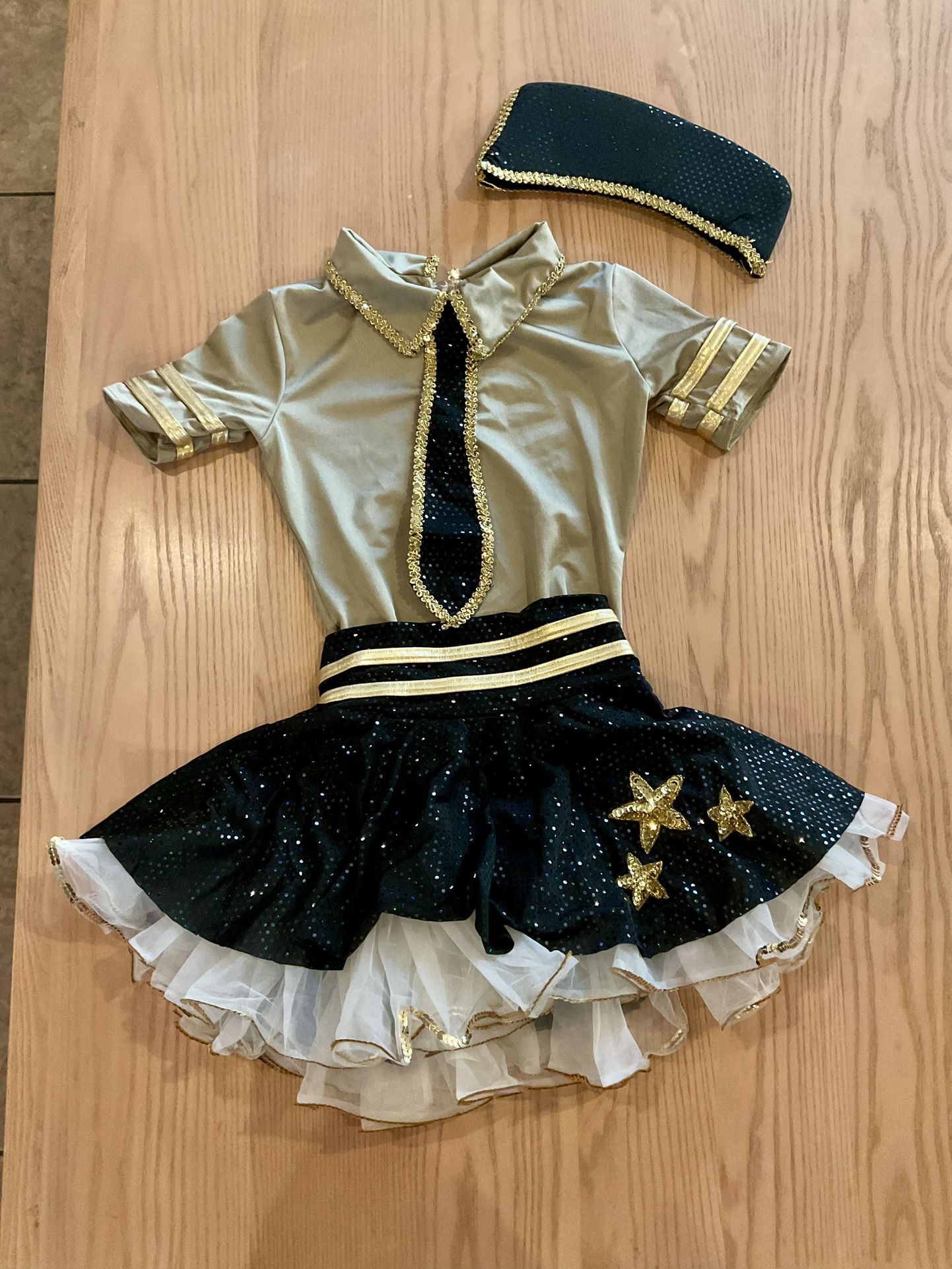 Sparkling black skirt with gold star embellishments and matched gold-trimmed top. Includes coordinating black and gold neck tie and short sleeves for easy movement. Layered white tulle underlay adds playful volume. Comes with matching gold-trimmed black hat.
