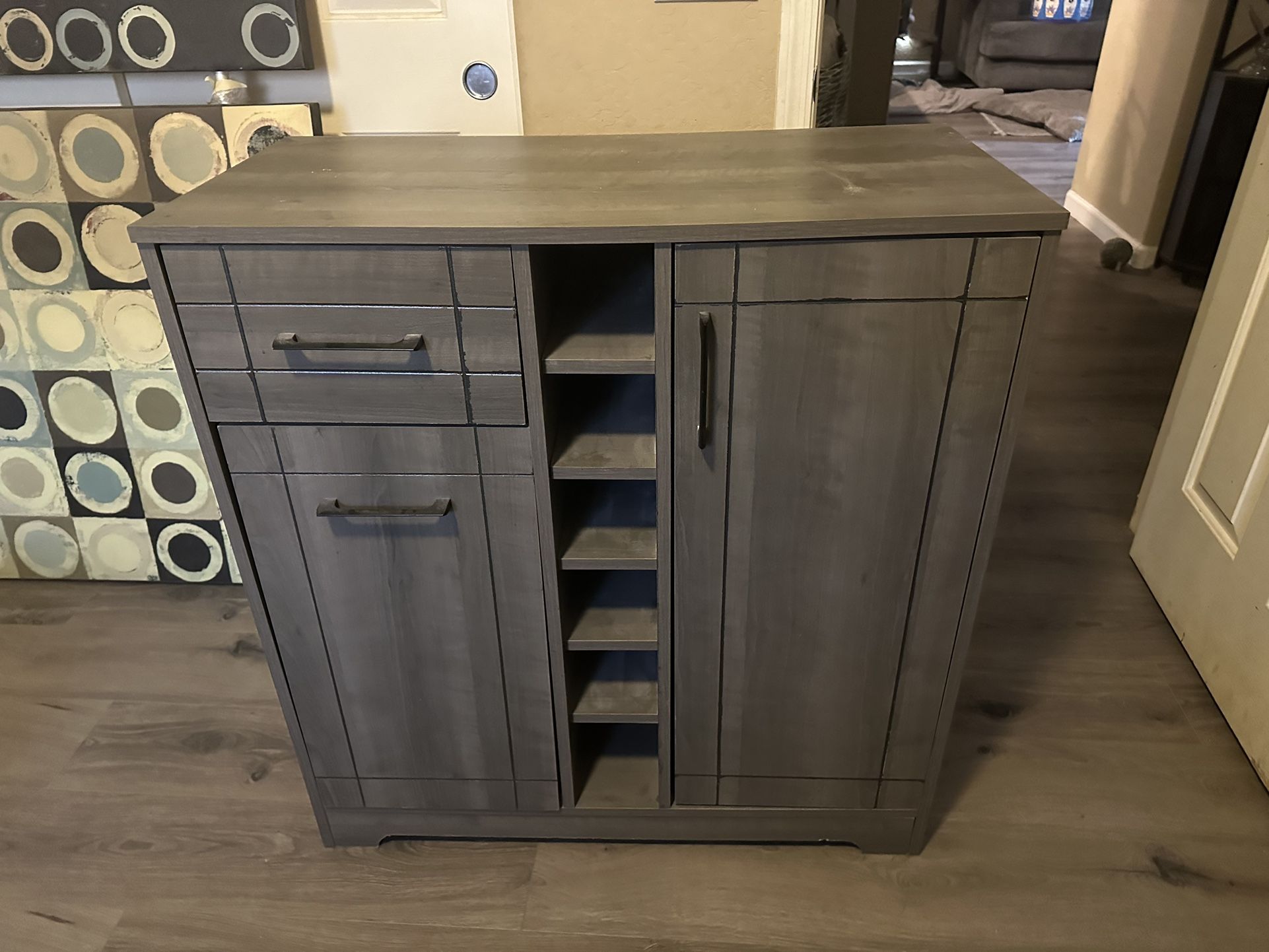 STORAGE DRAWER FOR BOTTLES: The drawer is just the right depth for arranging your wine and liquor bottles. • STORAGE DRAWER FOR ACCESSORIES: It’s always handy to have a bottle opener and some coasters within easy reach! • STORAGE COMPARTMENT: Set up with glass holders and a shelf, you’ll find it truly useful for organizing your space. • A RACK FOR BOTTLES: Six shelves give you even more bottle storage space. • TOWEL HOLDER INCLUDED: You can hang a towel on the right side.