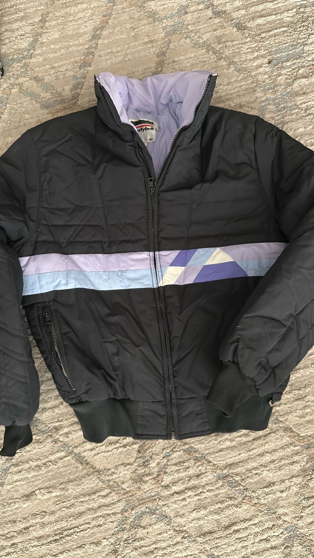 Ski jacket will fit a small woman, large girl. Worn once. All zippers intact. Great buy! Machine washable. Black, lavender, light blue. (A)