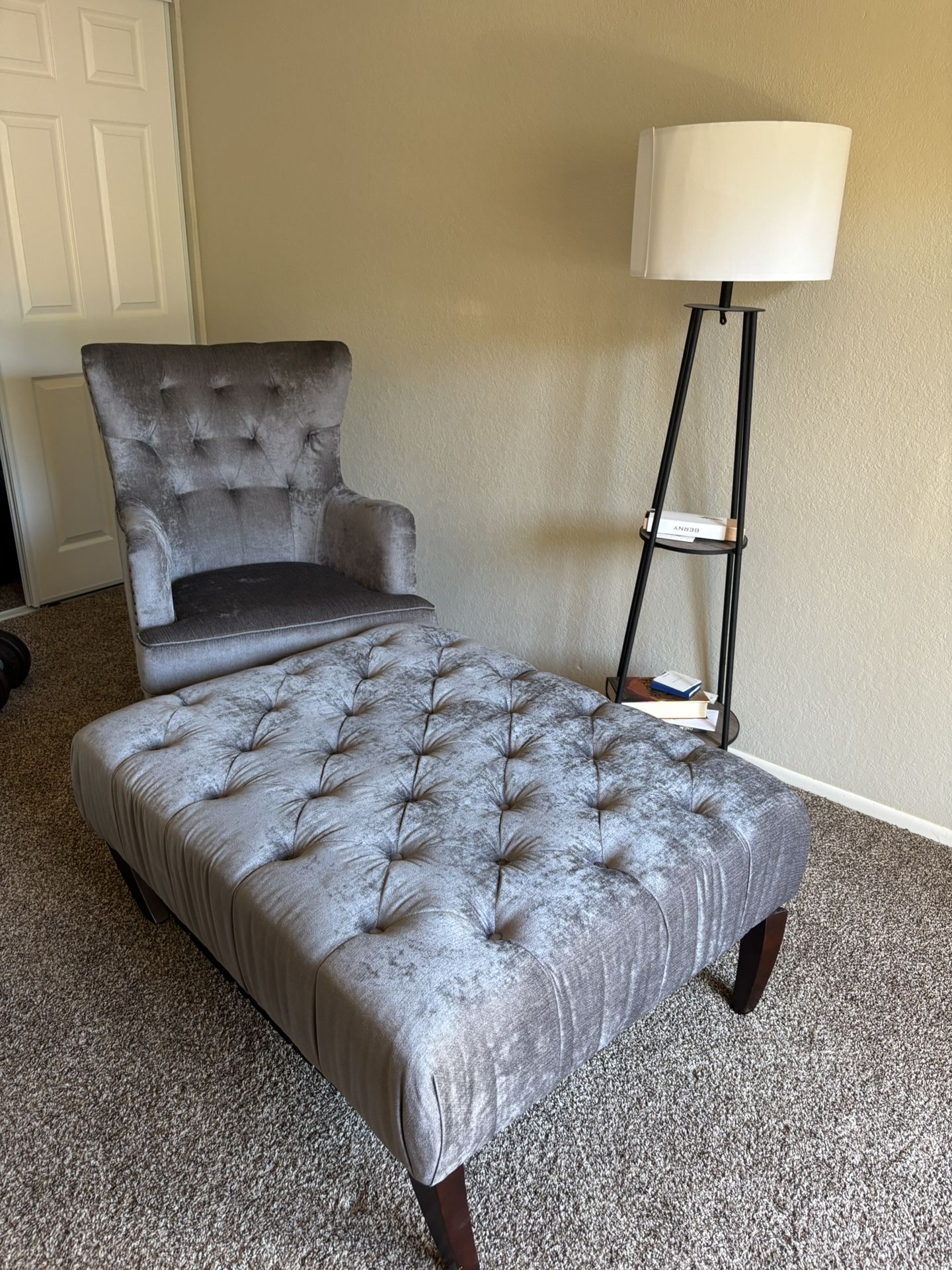 Tufted accent chair for sale in a soft gray velvet fabric with dark wood legs and a classic, elegant look. Great for a bedroom, reading corner, or lounge space. A matching ottoman is also included for free. One of the ottoman legs is broken, so it will need repair if you want to use it as intended. Pickup only in West Hills. Dimensions: Armchair: 39”H 27.5”W 28”D Ottoman: 17.5”H 43”W 35”D