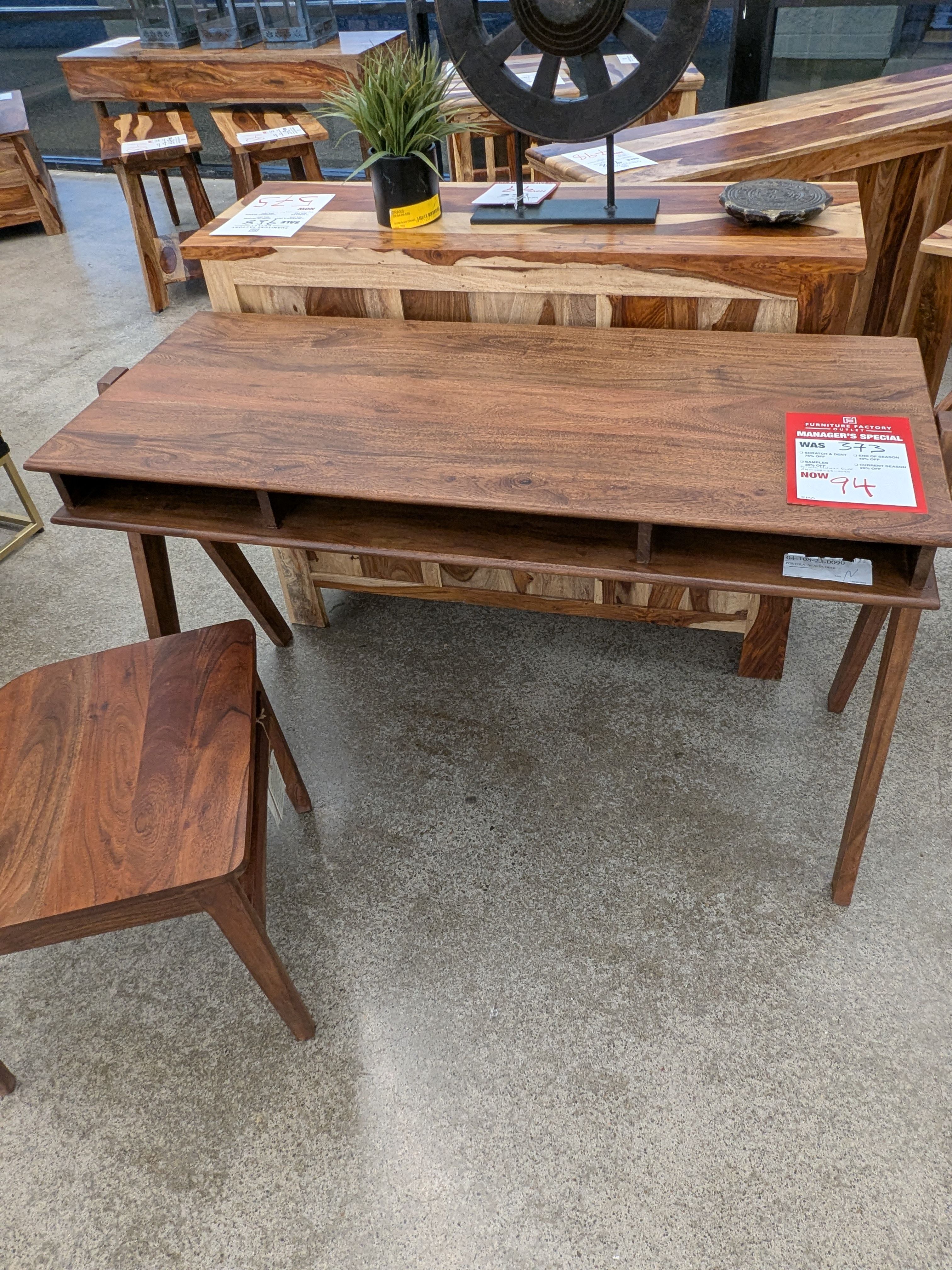 The Portola Desk is inspired by a mix of Asian architecture and mid-century modern styling. Featuring flared legs and beautiful solid natural acacia wood in a walnut finish, this open shelved desk has a narrow profile perfect for today's modern home. Item Width (Inches from side to side) 49.5 Item Depth (Inches from back to front) 20 Item Height (inches) 31.5 Call Ahead For A 2 Hour Hold & Financing Options Are Available