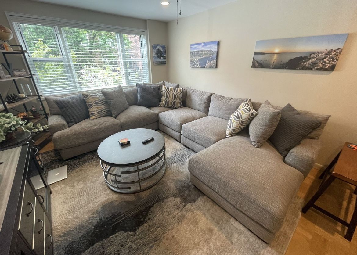Little over a year old sectional couch. Super comfy and can fit a lot of people on it. From Raymour & Flanigan. I can throw in the tables pictured if you’re interested.