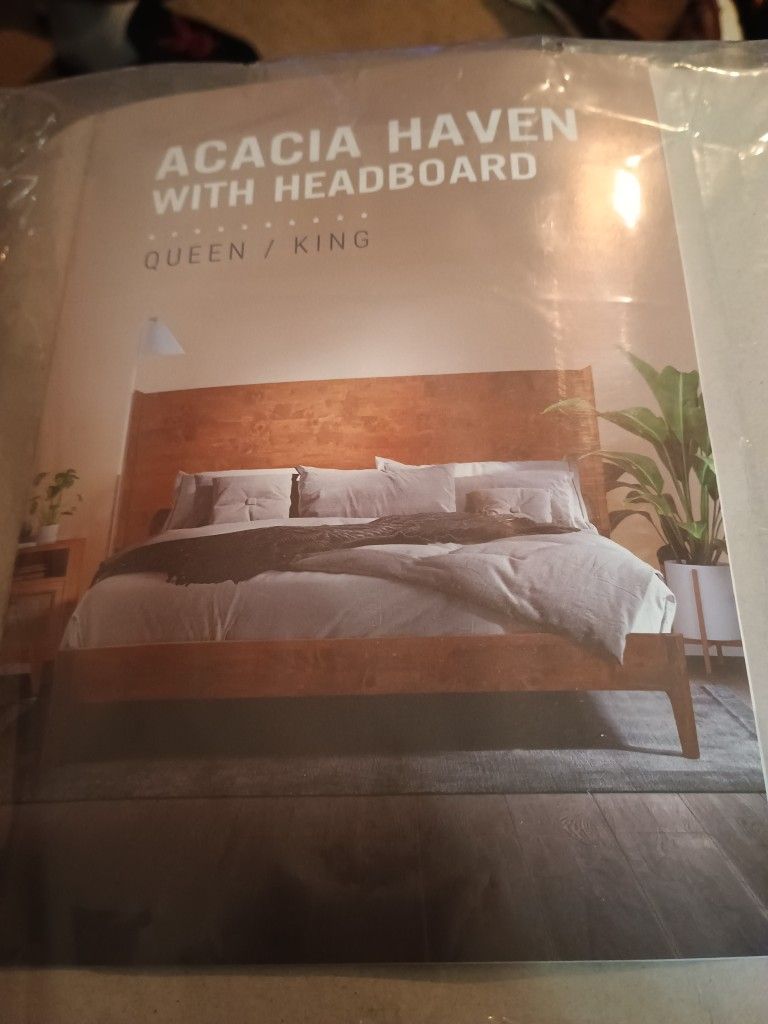 Acacia king size bed beautiful true wood color** wood, simple to put together** slots** has headboard** Sells for 500+ no box spring needed** only matress** Brand new***