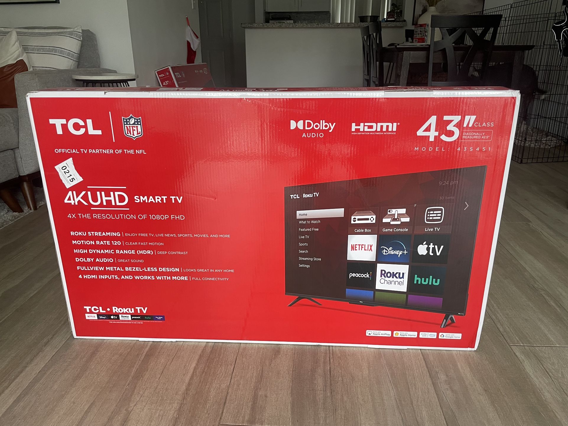 Brand new, never opened TCL 43” 4K UHD HDR Smart TV. Includes original box, remote, and all accessories. Nuevo, nunca abierto, televisor inteligente TCL de 43” 4K UHD HDR. Incluye la caja original, control remoto y todos los accesorios.