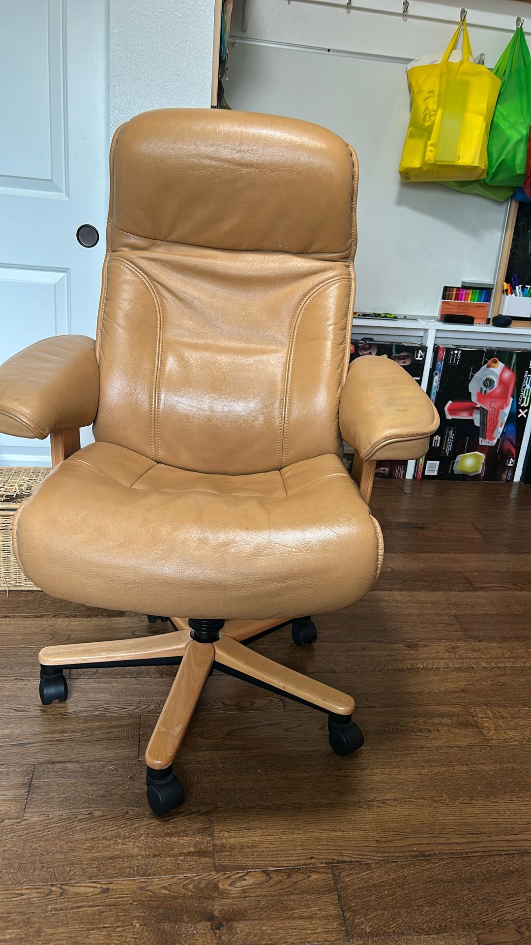 Sturdy tan leather chair with blond wood base. No rips or tears or broken stitching. There is some wear on each arm (see photos). Adjustable seat height from 17-21" ( see photo of lever) seat width 21"; seat depth 19"; back height from seat 28"; back width 21"; back can be adjusted (picture shows most upright position - see photo of knob for adjusting back). Non-smokers, no pets.